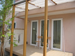 以前からあった木樹脂ウッドデッキの上に、もっとデッキが使いやすくなるように、ココマオープンテラスをバルコニーの壁から掛けました、色はイタリアンオールナットの明るい色で内部日除けは清潔な感じのするホワイトで、道路側に面した側面には、ブロバンス瓦を乗せた塗壁をつくり、より使い勝手のよい空間にしています、庭との一体感のあるココマオープンテラスです。