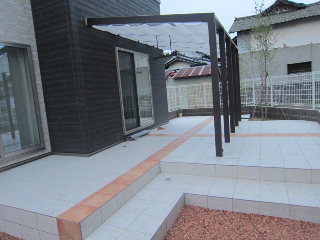 庭の手入れを気にするお客様が増えています。リビングの前の庭いっぱいにタイル貼りの床を作り、広いタイル貼りの床の上にココマオープンタイプテラスを施工しました。場巾が8尺あるココマテラスは、雨の日でも塗れることのないスペースが広くあります、タイル貼りの床は隣の部屋からもタイルの上を歩いていける広さで、白いタイルにテラコッタカラーのラインを入れています。床には何か所かLED照明が埋め込まれているので夜になつてもテラスで過ごすことができます。