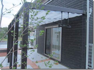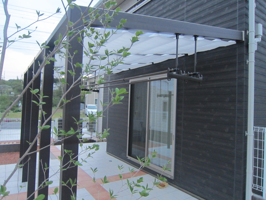 テラスには、日除けが必需品です、新野様のお宅はホワイトの日除けが付いていて、必要な時に引きおろし、使わない時には、建物側にたたんでおきます、天然石貼りの床は、自然な色なので飽きる事もありません、愛犬と過ごすテラスでの時間がとても楽しいです。