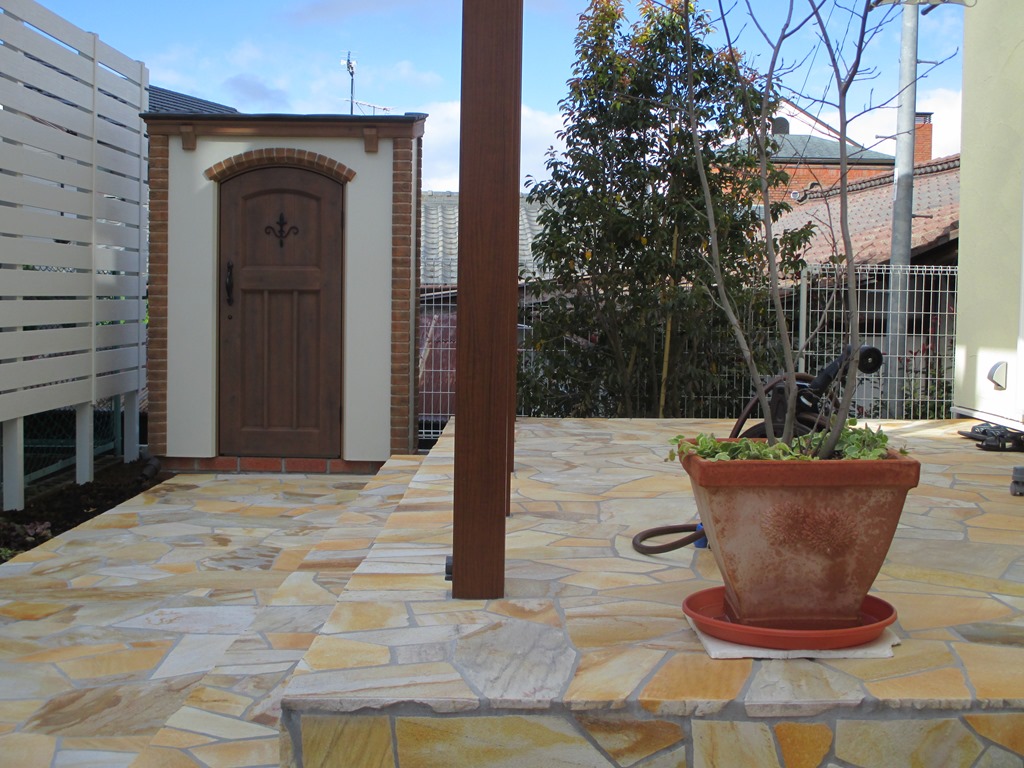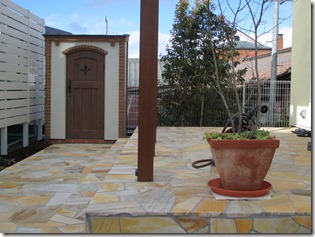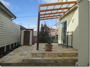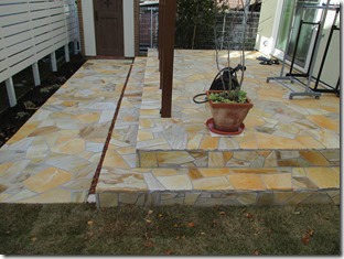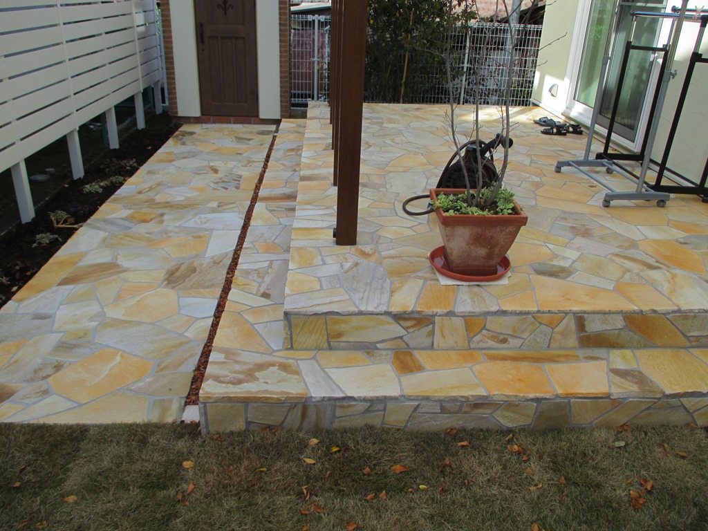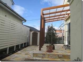 テラスの床の施工にはイタリア製の300角タイルで施工することが多いのですが、天然石を貼って欲しいと言う要望もあります。リビングの掃き出しから少し下がったところがココマオープンテラスの床の高さにしました、テラスの床の前面・側面にステップをつけ、ここも天然石を貼ってしあげました。隣地境界の境にはアルファウッドを高さ2メートル30㎝で施工して目隠しにしています。デラス前面にはわずかな巾の土にか残らなかったので、庭も花壇スペースを残し後は天然石を貼った床で仕上げました。