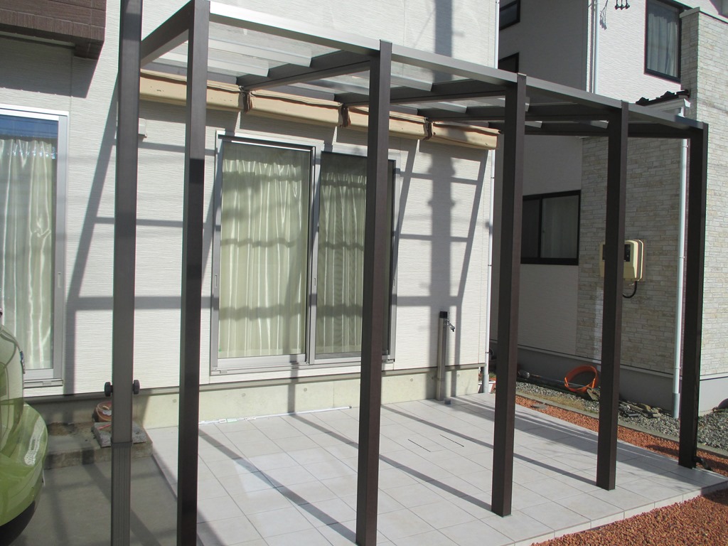 ウッドデッキでは無く、メンテナンスのあまり掛からないタイル貼りのテラスを作り、テラスを使いやすくする為に、屋根を掛けました、ココマテラスオープンタイプは、約90?ピッチで木目調の柱が立つ高級感のあるテラスです、屋根を掛け日除けを取り付けることで、陽射しの強い日でも、テラスで快適に過ごす事ができます。