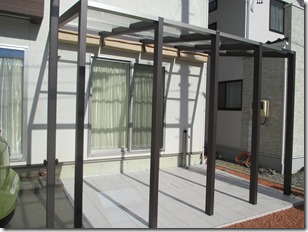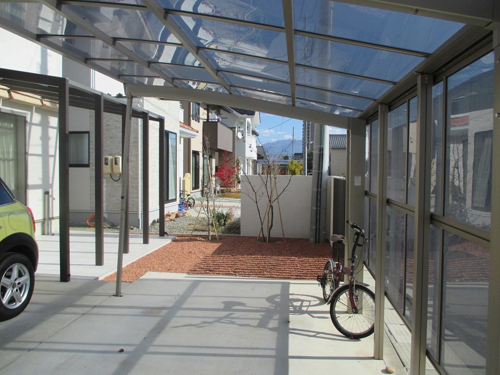 リビングの前に出巾1.5間の腰壁タイプを施工して、横に連結して出巾1間のオープンタイプを作り自転車が置けるスペースにしました。見た目だけでは無く機能的にも優れているココマです。自転車置き場は、子供達の成長と共に、将来使用しなくなることが多いです、自転車置き場を庭に単独で施工するよりもテラスを兼ねて使用した方が利用価値があります。無駄のないエクステリア工事も大切です。
