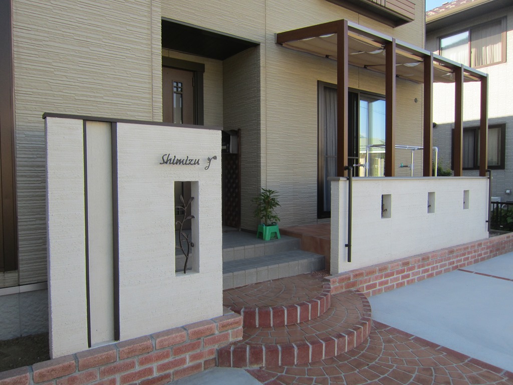 ココマの側面が道路側に向いているので、腰壁を折り返して作りました、そしてその壁に水道を取り付け蛇口の下に水受けをつくっています、アクセントにカルセラも貼りました、不凍栓は裏側に持っていき表からは見えません、蛇口のフクロウが可愛いですね。