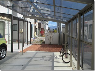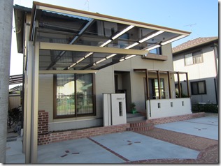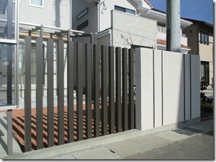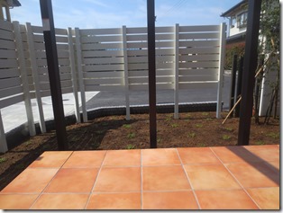 間口が1間半のココマテラスの中央を通路にして、両サイドには本体と同じ色の縦格子を取り付けました、塀はあるものの道路からリビングまでの距離がさほどないので目隠しとして付けたものです、これでリビングからの目隠しも兼ね外に出て寛げる空間が出来ました。