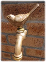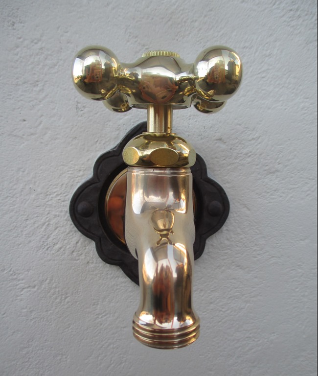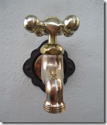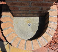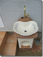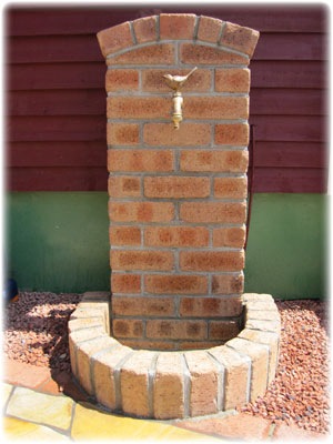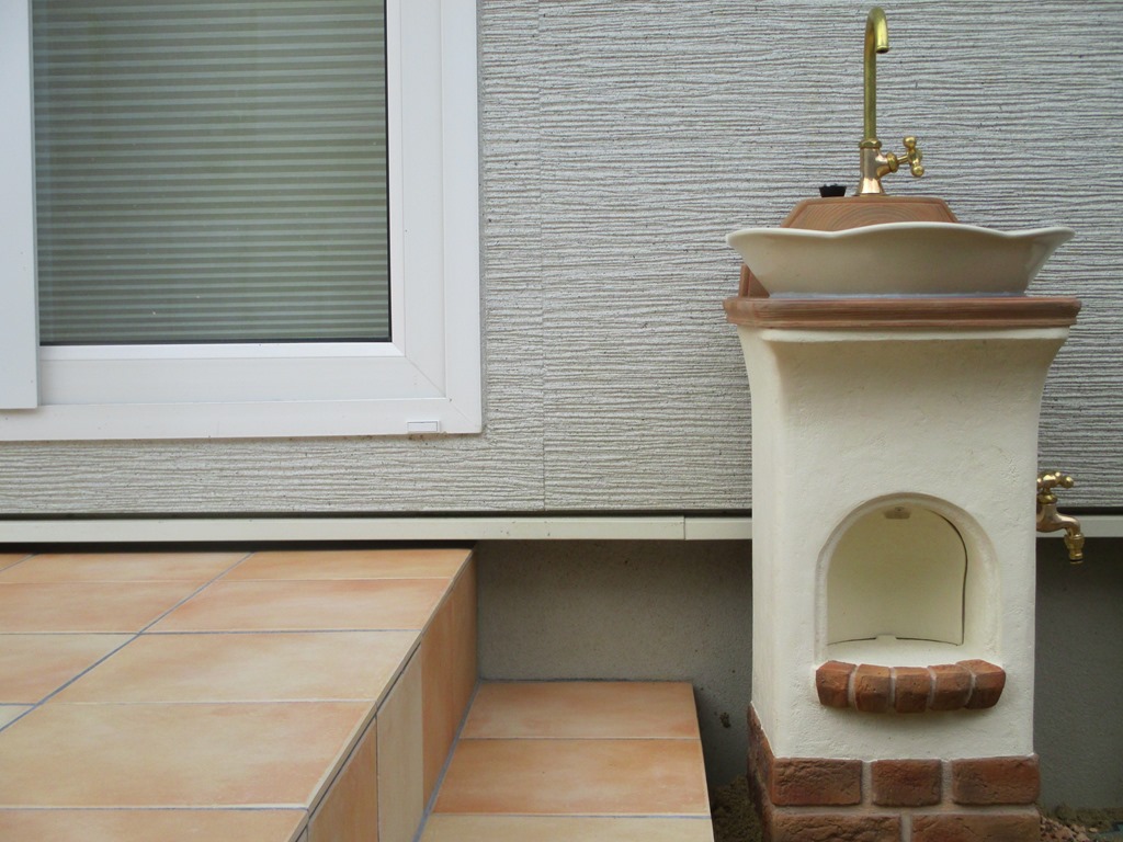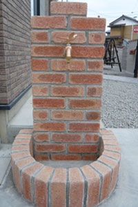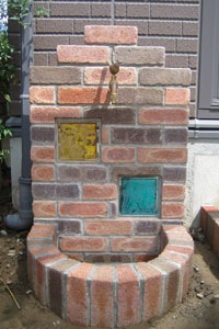 不凍栓の前にレンガを積み上げ、不凍栓を正面からは見えなくして、プラスチックで作られた味気ない水受けは取外し、レンガを立てにしてRに施工する、中の床部分は防水モルタルで仕上げれば、それまで殺風景だったものが明るく楽しく変わります。 蛇口もデザイン蛇口に変えれば完成です。
