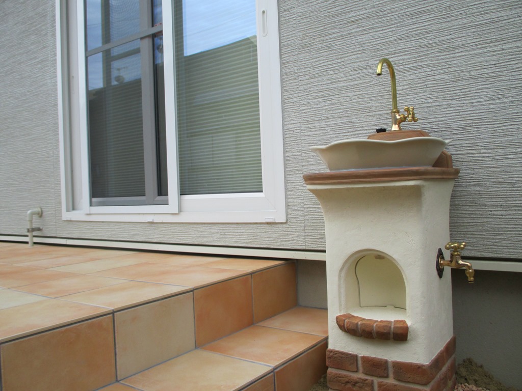 リビングの前に作られたタイル貼りのテラスの横にスタンドウォッシュリリのオレンジカラーを取り付けました。立ったままの姿勢で洗い物ができる今までのエクステリアでは、あまりなかったスタイルの立水栓です、本体側面にも補助蛇口があり使い分けができ便利なスタンドウォッシュリリーです。もともとこの場所には、不凍栓が建っていましたが、他の場所に移動させリリーを設置しました、便利さももちろん大切ですが景観を壊さない事も大切ですね。