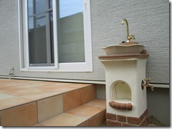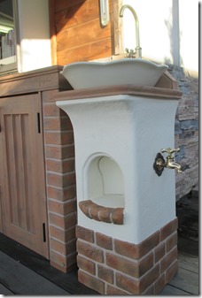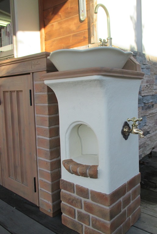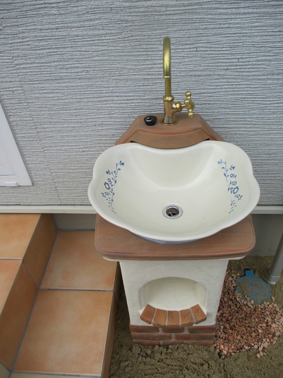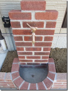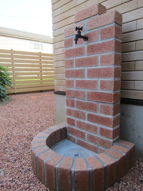 レンガを不凍栓の前に積み上げる事で、不凍栓を隠すことができます、積み上げたレンガに穴を空け蛇口もお洒落なものに変え、積み上げたレンガの巾でレンガを立てて施工して水受けを作ります、後は床部分を防水モルタルで仕上げれば完成です。