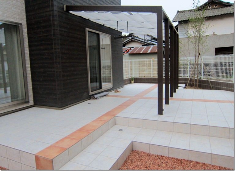リビングから南側の隣地境界までタイル貼りの床にして間口が2間で巾が8尺のcocomaオープンタイプのテラスを掛けたエクステリアの施工現場は上田市です。 イタリア製輸入タイルの外用で滑りずらいタイルの白系とテラコッタ系の二色のタイルを使用してテラススペースを施工しています。