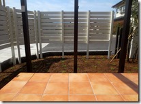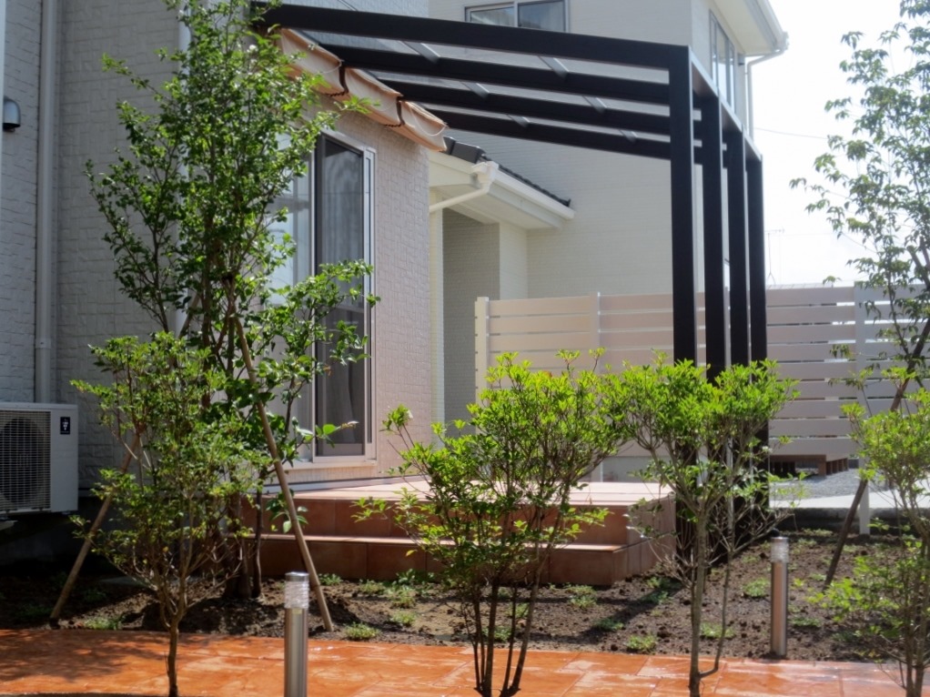 境界は、目隠しの樹脂板塀で庭の木々に囲まれてテラス空間は癒しの場所になります。