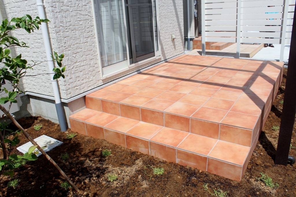 テラス下のタイル貼りは、イタリア製の外用(ノンスリツプ)のタイルわ使用しています。大きさは30㌢角タイルを使用しています。