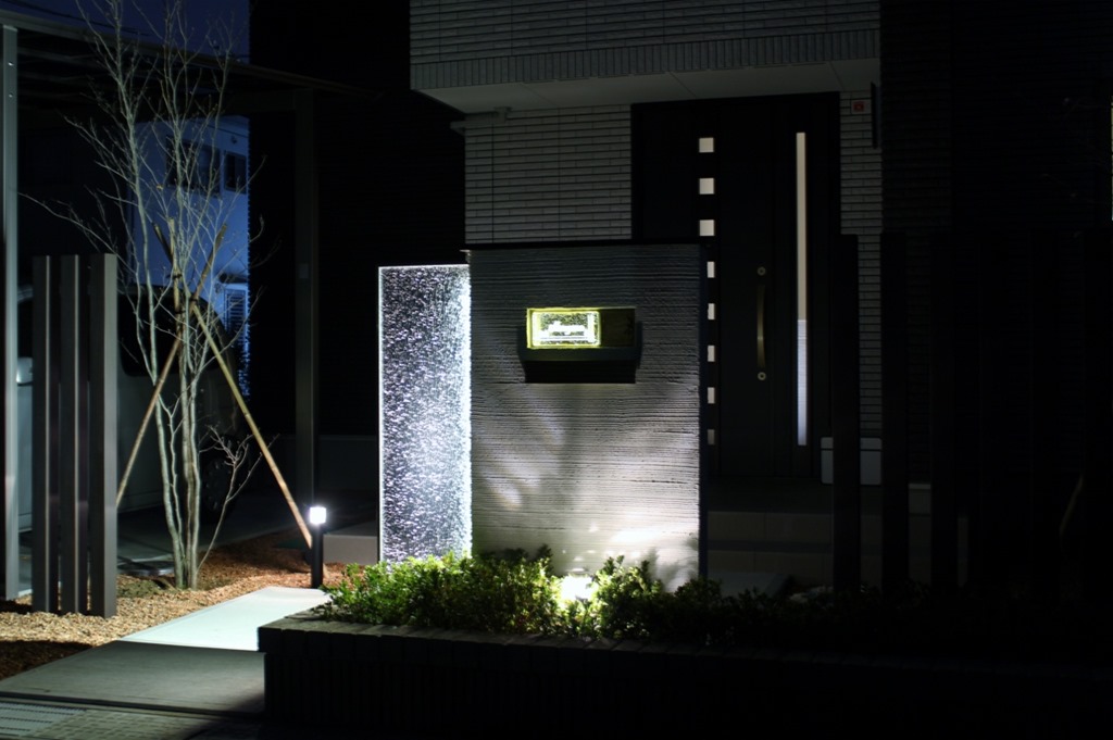 ジェエルグラスの取り付けられた門柱をライトアップすると、きらきらととてもきれいです。LEDテープを巻いたサインも明るく見えています。