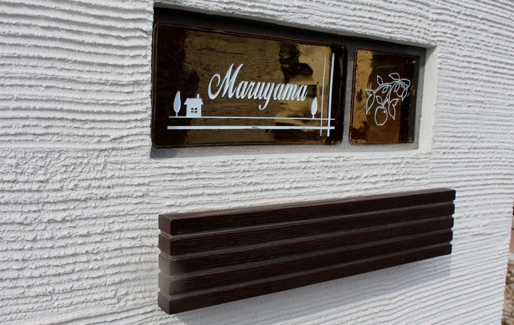 ジュエルグラスカラーのブラウンに合わせて、ベネチアンガラスブロックサインを同系色で門柱に取り付けました。