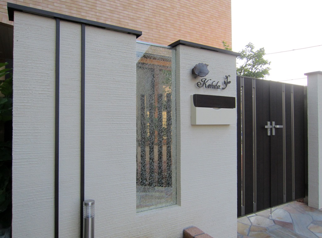 アルミ門扉を取り付ける門柱のデザインは、門扉の両側に壁が付きます。左側の塗壁にジュエルグラスやサイン・ポスト・表札灯を取り付け、シンプルに縦ラインにハーフティンバーを取り付けた門柱です。