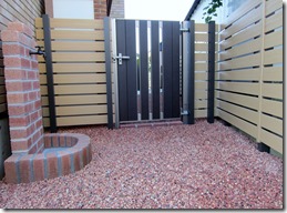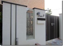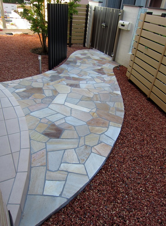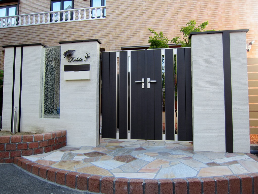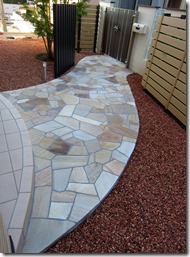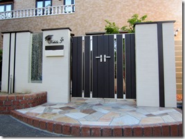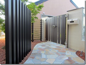 クローズされた門扉を開けて玄関に向かう通路の床は天然石を貼りました、門柱と玄関の間にはアルミのポールを建てて雰囲気を変えています。