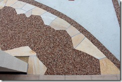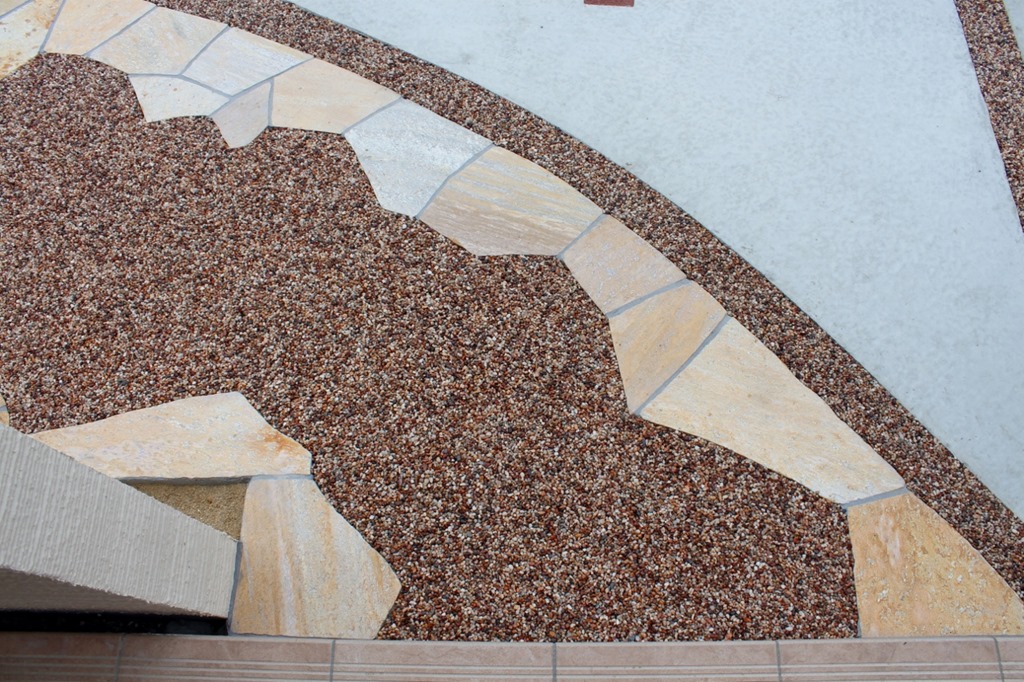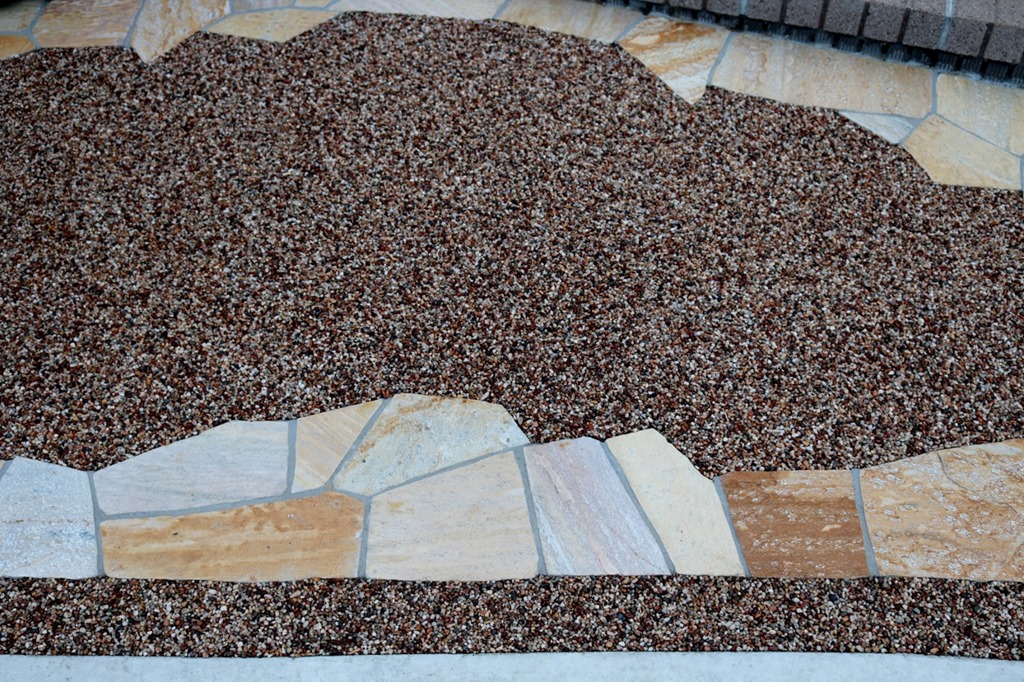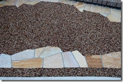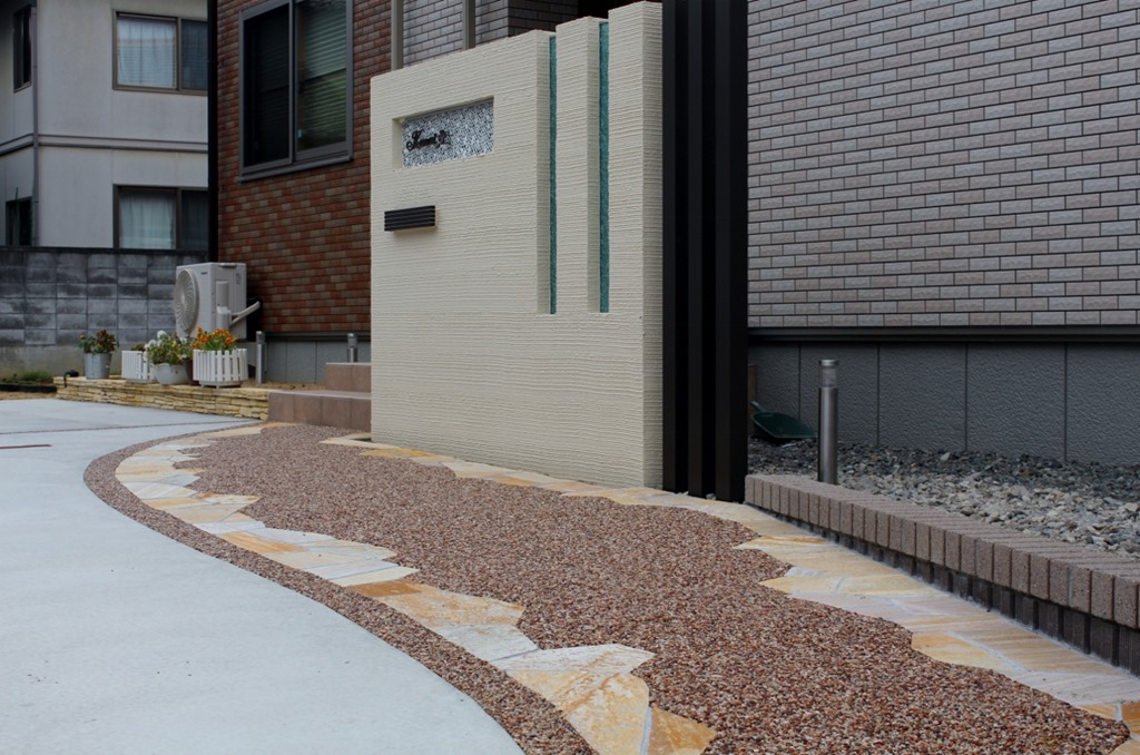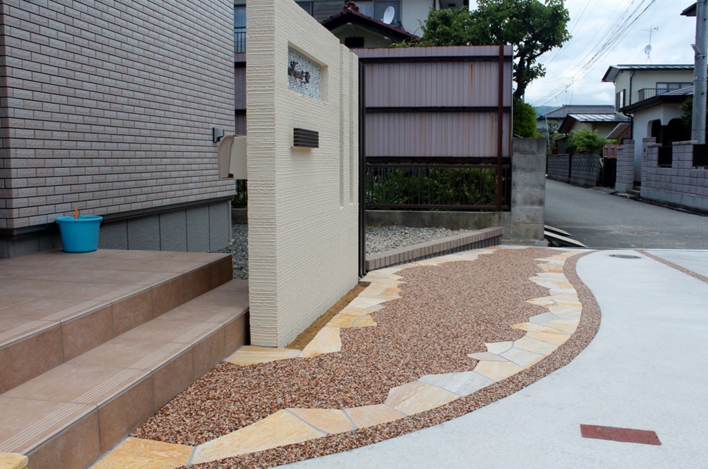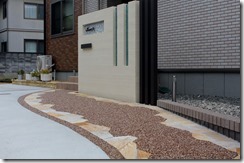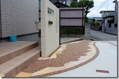 道路から門柱の前を通りアプローチを作りましたが、通路の縁は天然石を貼り、その中側を天然石小砂利で仕上げました。