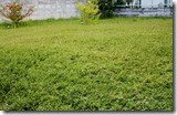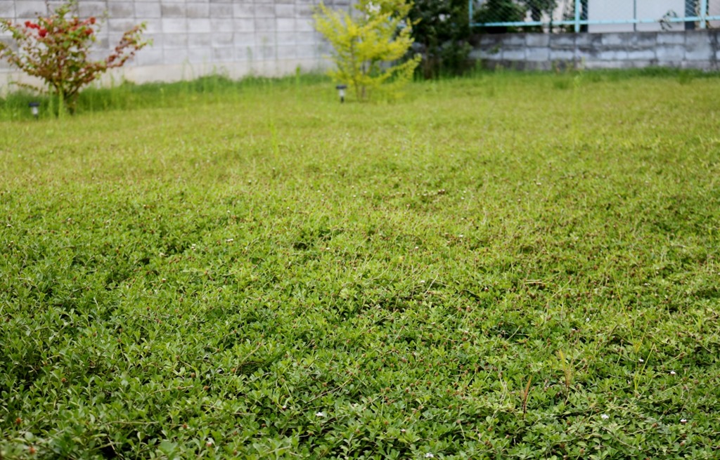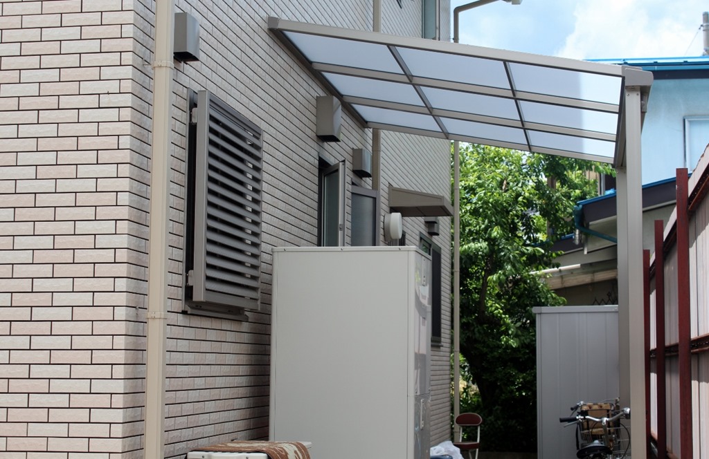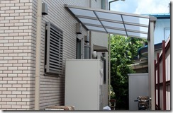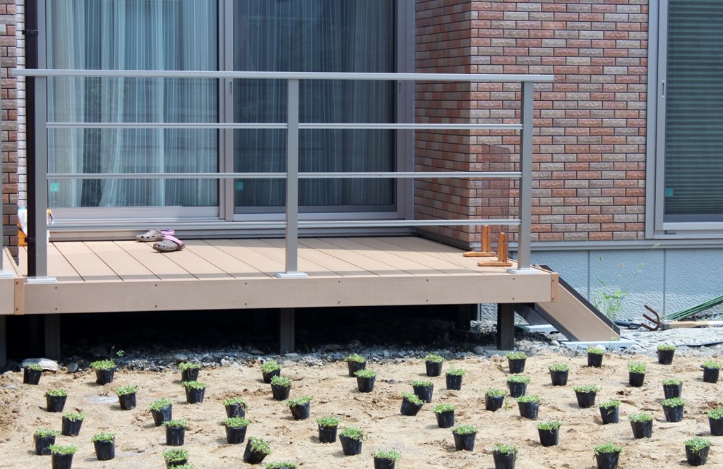 建物の北側にアルミテラスを掛け、自転車置き場を兼用させました。庭も広くクラピアを植えて芝生の代わりにしました。