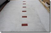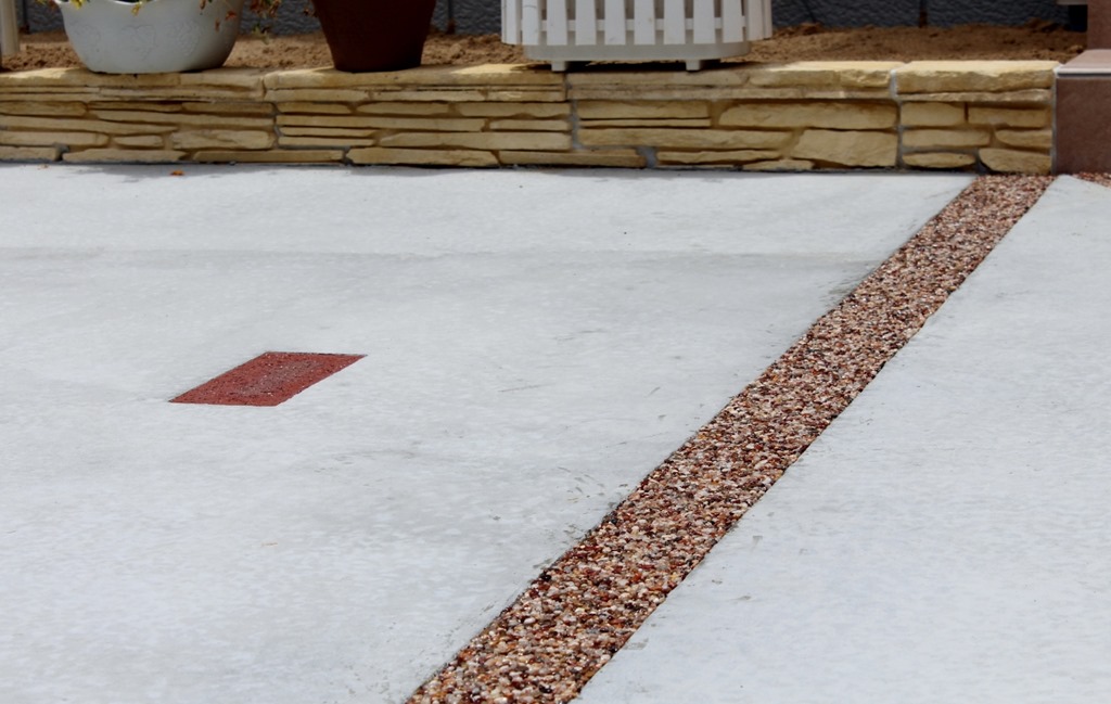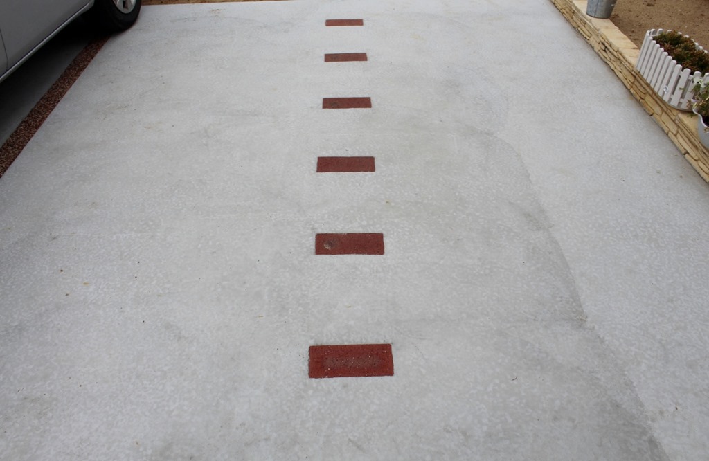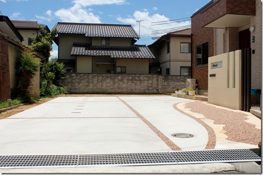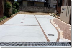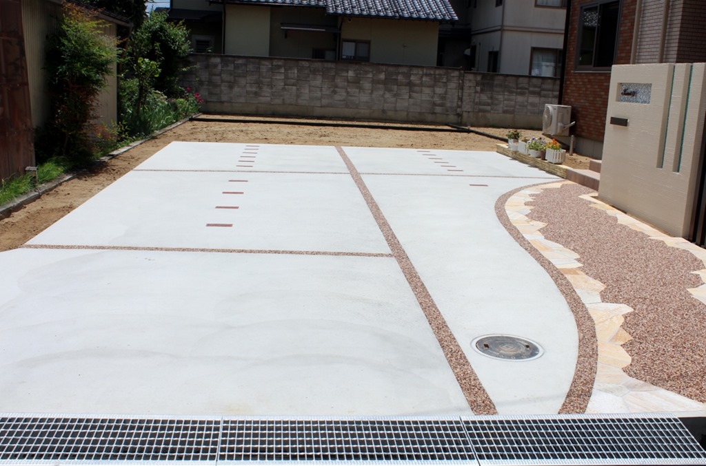 駐車場のコンクリートの目地は樹脂舗装で、コンクリート床と同じ高さに施工しています。アクセントにレンガも土間の中に埋め込みました。