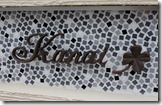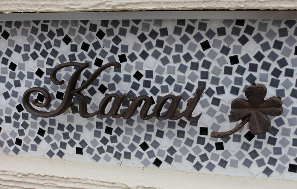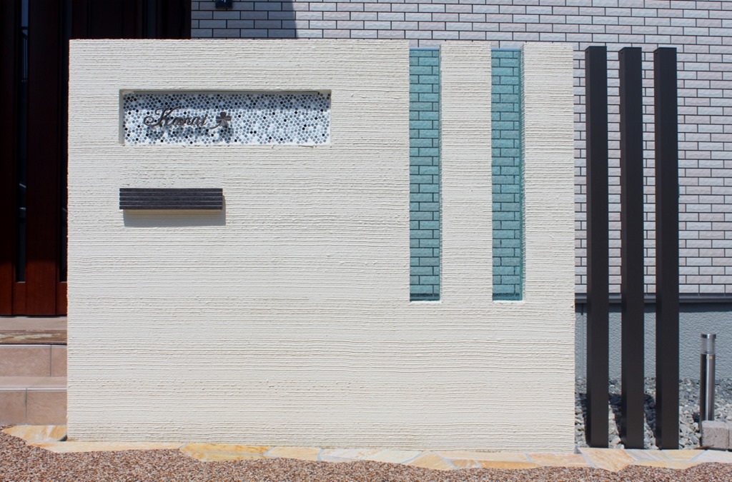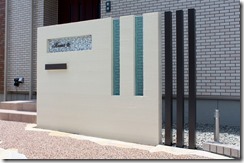 ジョリパットで仕上げた塗り壁の門柱にスリムジュエルを2枚組み込みサイドにアルミ各柱を三本、サインの取り付け部分の壁は凹凸にしてタイルを張りアルミ鋳物サインを付けました。
