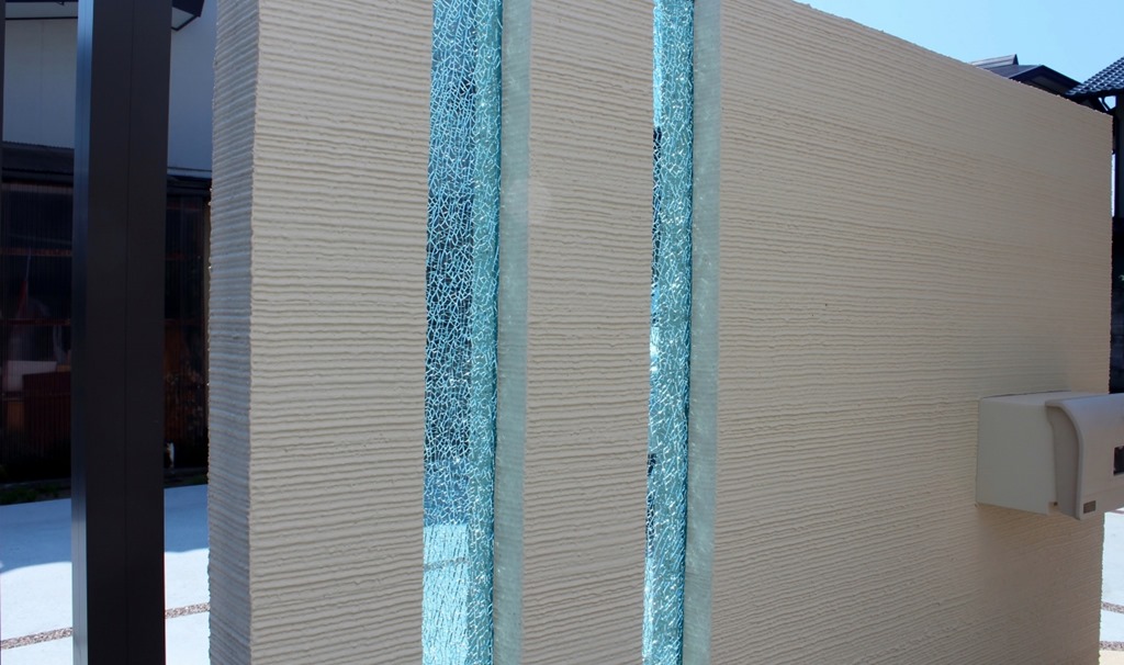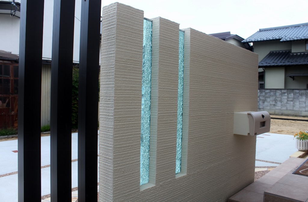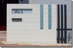 頑張れば6台の車が止められる駐車場の土間コンクリート、玄関前に作った塗り壁の門柱はジュエルグラススリムを2枚取り付けました。