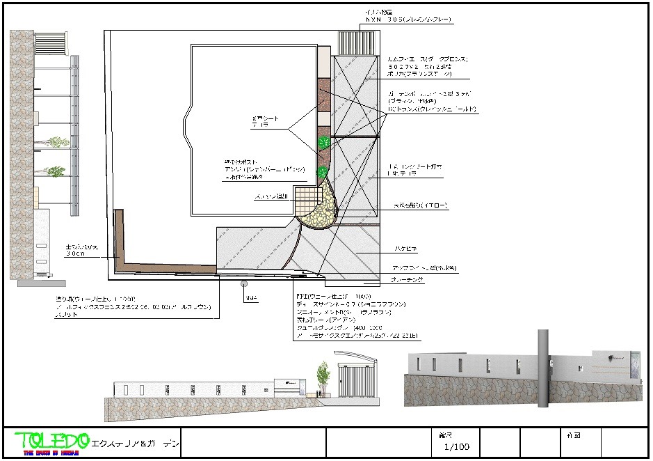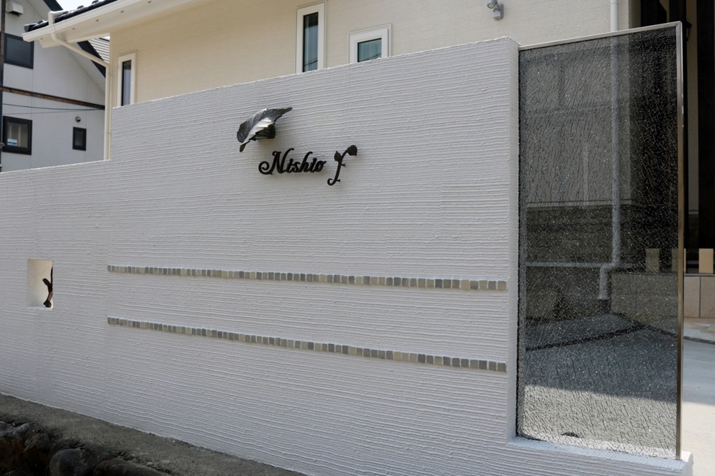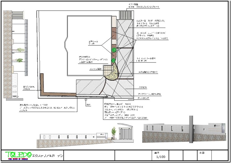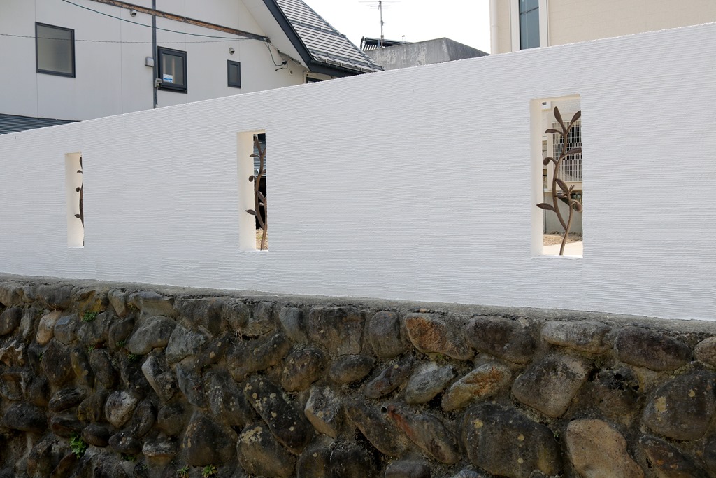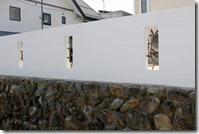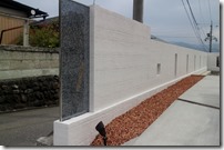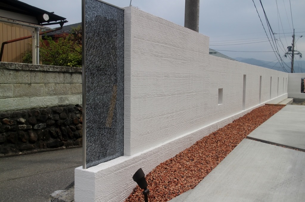 高さのある石垣が積まれた敷地の外構は、落下防止を考えながらデ゛ザインされた長い塗壁の外構は長野市内の現場です。