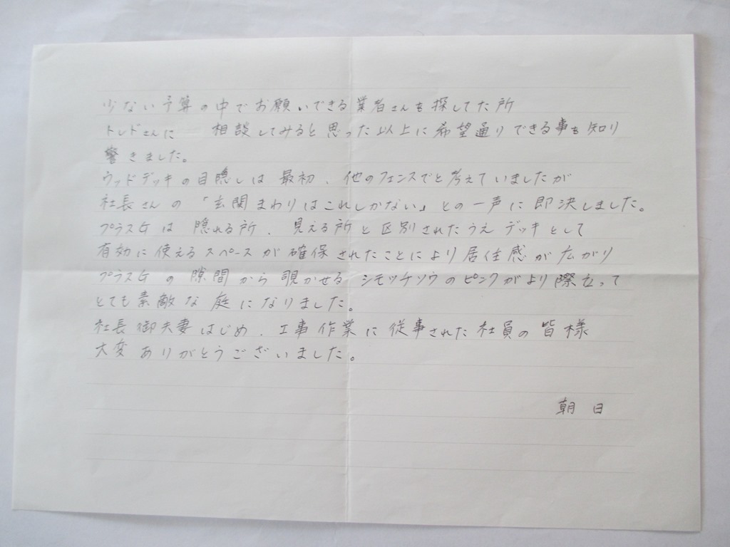 ウッドデッキの目隠しは最初、他のフェンスでと考えていましたが、社長さんの「玄関まわりはこれしかない」との一言で即決しました。 プラスGは隠れる所、見える所と区別されたうえデッキとして有効に使えるスペースが確保されたことにより居住感が広がりプラスGからの隙間から覗かせるシモツチソウのピンクがより際立ってとても素敵な庭になりました。