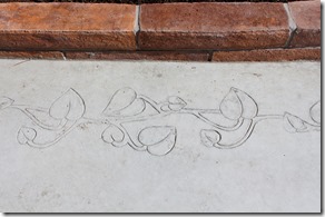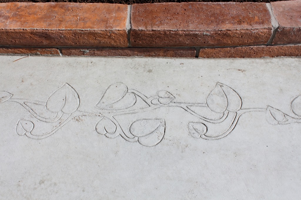 通路と駐車場を兼ねたコンクリートの土間は、通路部分をスタンプコンクリートの木目で仕上げ、駐車場部分は通常のコンクリート打ちですが縁部分にボーダーアートの形押しアイビーを施工しました。
