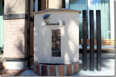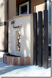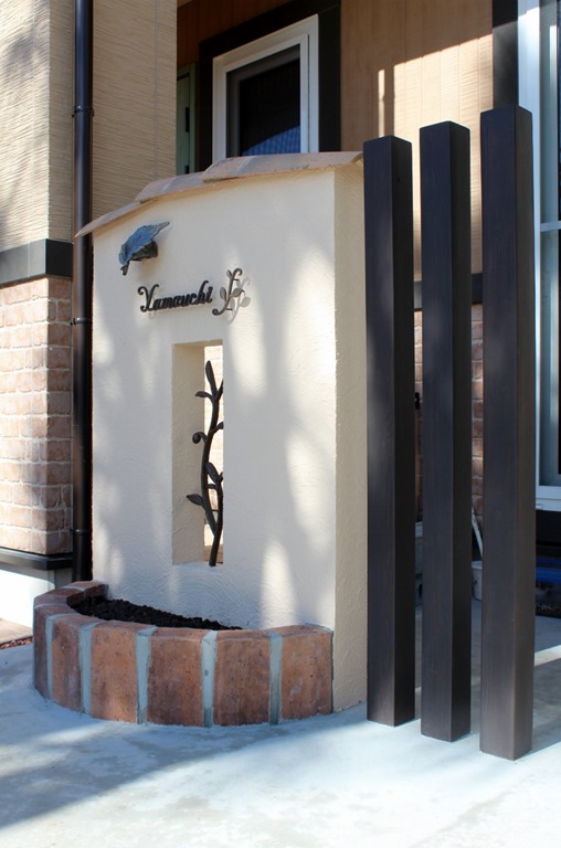 門柱は塗壁でプロバンス風様瓦を乗せ、ディーズサインのA-07にミニオーニメントAを取り付けています、サインを照らす葉の形をした表札灯リーフも付けて夜でもサインが分かるようにしました。 スリツトを空けた中にRフィックスフェンスを取り付け、門柱手前にレンガ花壇、横にFRP製のティーバーポールを3本建てました。