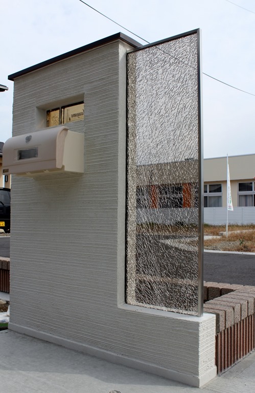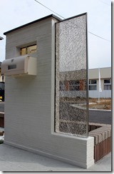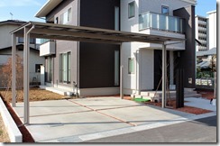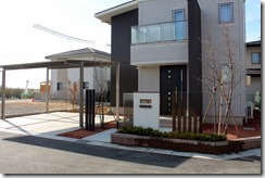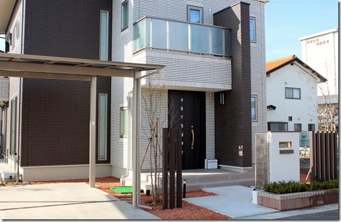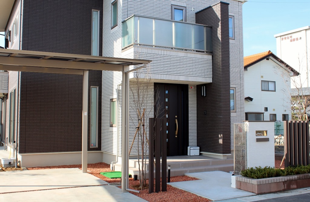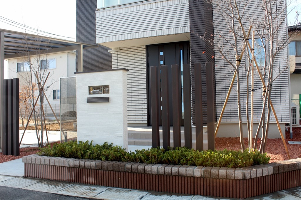 建物に合わせたエクステリアデザインはシンプルに素敵にです。 門柱にブラウン色のカラージュエルグラスを取り付け、横に少し間隔を置きディーズガーデンのティンバー(ポール)を6本立てました。