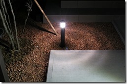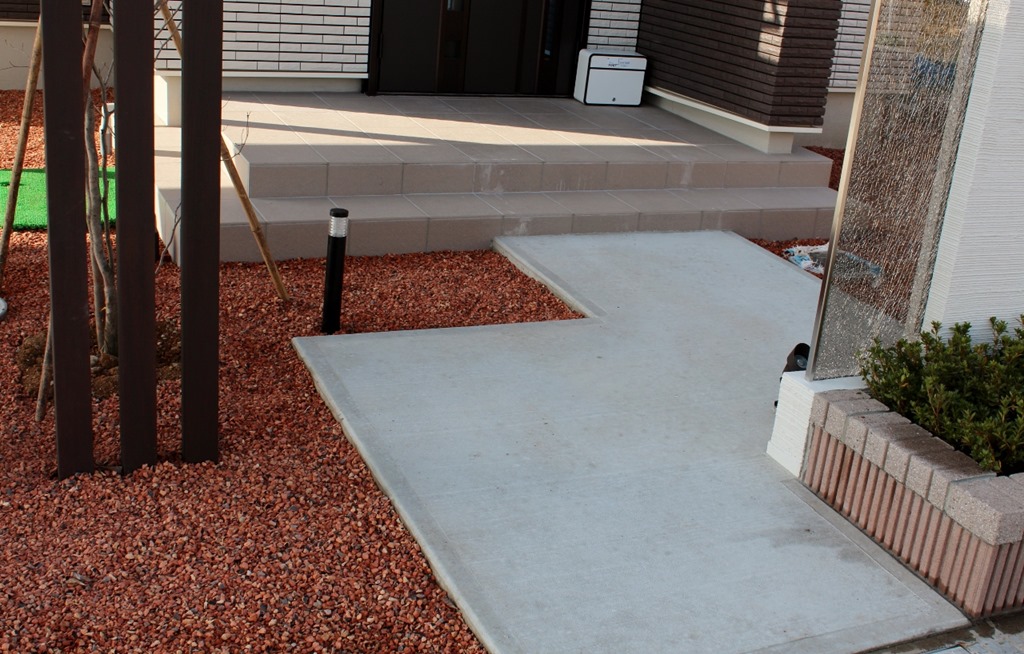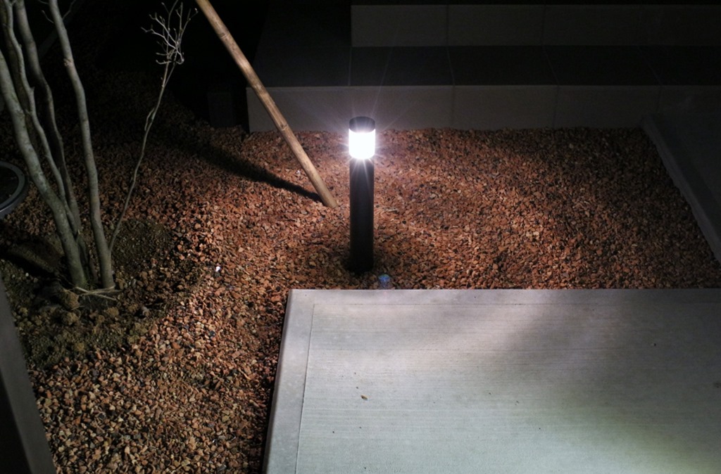 通路はシンプルにコンクリート打ちだけですが、充分に素敵です。 夜になると点灯する照明も今のエクステリアには欠かす事が出来ない商品です。