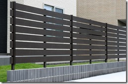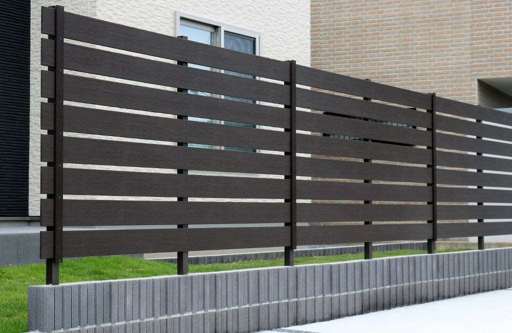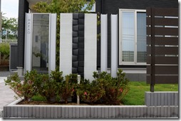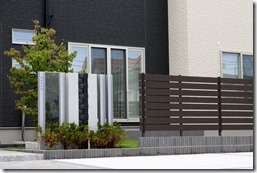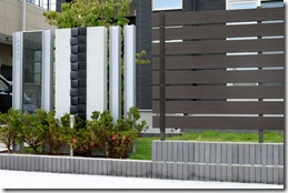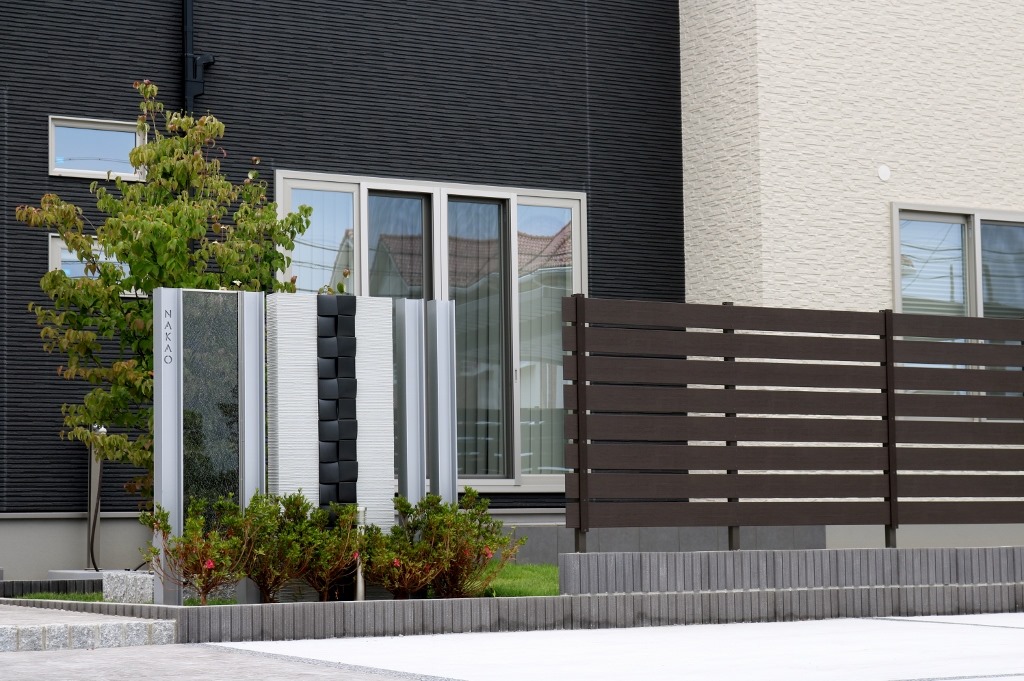 建物に似合ったカラーで施工したエクステリア現場で、プレミアム門柱の高さに合わせて駐車場との境に樹脂板フェンスで目隠しをしました。