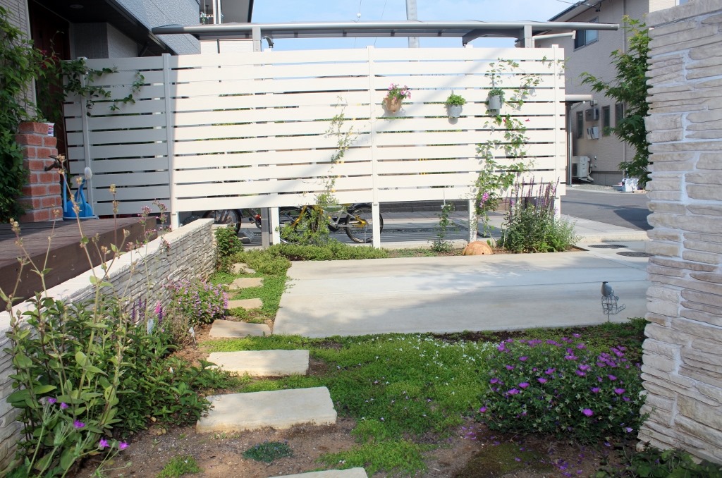 樹脂板塀で庭を挟むように施工した現場。 2017-07-172018-09-15 by View all posts by toledo 家の前の庭・駐車場の東西を樹脂板で目隠し施工した現場です、アルファウッド・アイボリーを東西どちら側も目隠し塀にした現場です。アルファウッドは庭の緑と似合うアイボリーを仕様。 アルファウッドの隙間に、ちょっとした小物を掛けハンキングなどもする事が出来るので楽しいです。 西側は既存の基礎があったのでレンガブロックを積んだ上にアルファウッドの施工をしました。 アルファウッドで楽しい庭空間を施工した長野市の現場です。