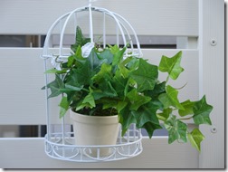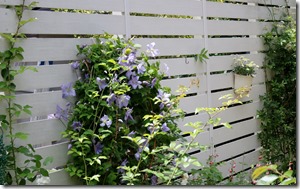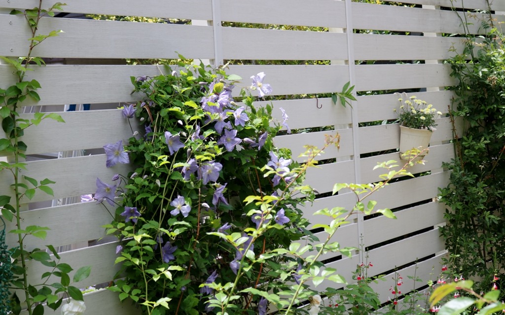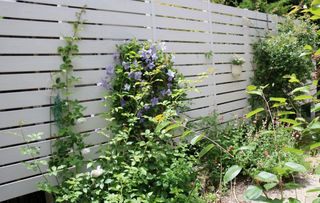 樹脂板塀を上手に利用してハンキングをしたり樹脂板に植物を這わせたりして緑の多い庭になっていました。