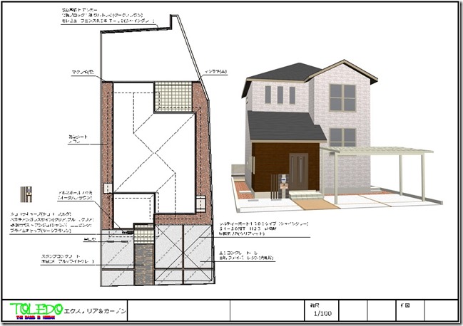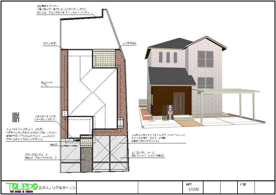 アプローチ-スタンプコンクリート「木目」 駐車場-ソルディーポート1500タイプH23「シャイングレー・屋根クリアマット」 コンクリート床の目地-ファイバーレジン「大和桜」 カーストッパー