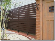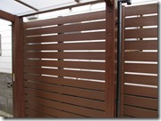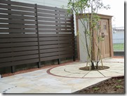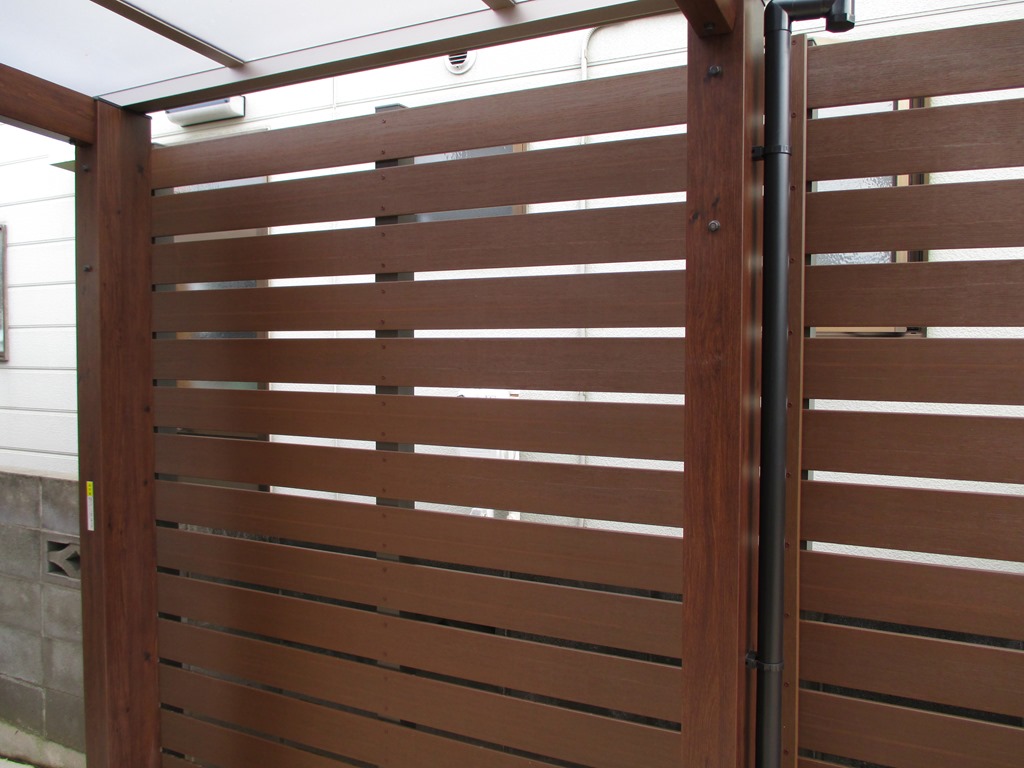 外構工事で南側の庭、隣地境界に70角のアルミ柱を立て高級樹脂板アルファウッドで目隠し塀を施工しました。板と板の隙間を2センチ空けて14段張り、地面から2メートル30センチの高さに仕上げました。目隠し塀の隅にお洒落な物置カンナを設置反対側には自転車置き場を作りました。