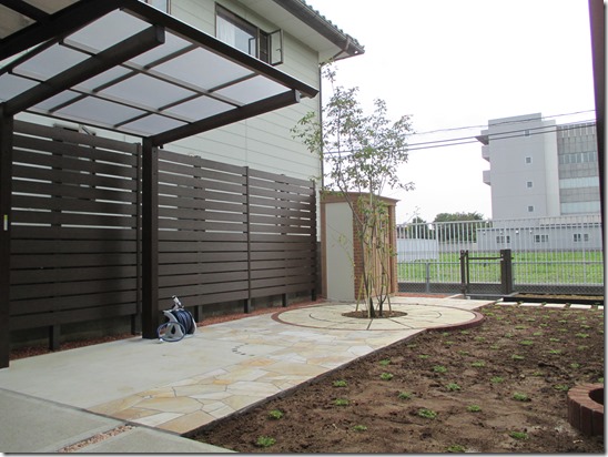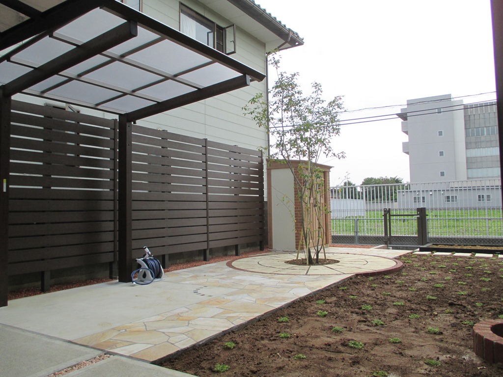 塀の前をコンクリート打ちにして部分的に天然石を貼っていめので、この空間で作業をしたり遊んだりしても目隠し塀があるので安心していられます。 長野市内のエクステリア