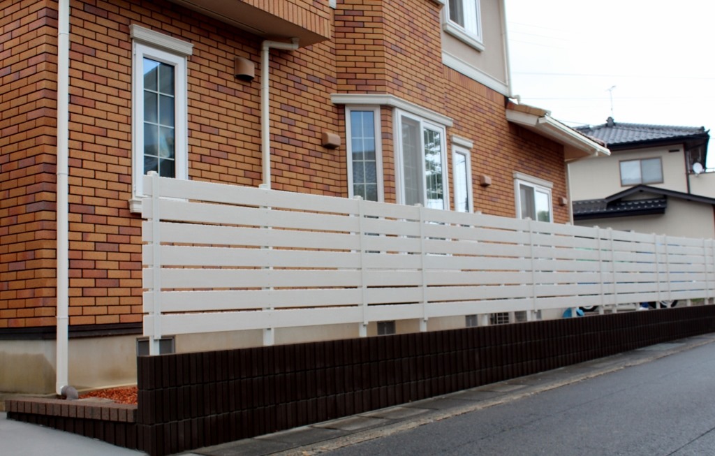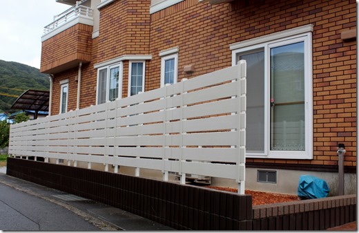 建物が映えるアイボリーの対候性樹脂板 2018-03-252018-11-10 by View all posts by toledo 煉瓦調の外壁の建物にアイボリーカラーの樹脂板がとても似合っている長野市内のエクステリアです。 化粧ブロックを積んだ上にアルミ柱を立てアルファウッド・アイボリーを7段張で施工、道路側と駐車場カーポート側面に取り付けました。 ディーズガーデン対候性樹脂フェンスAlphaWoot Aiborī「アルファウッド・アイボリー」