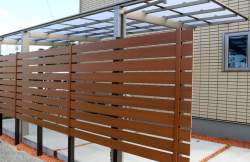 道路側はアルミ70角の柱を立てて上から10段張りMighty Wood「マイティウッド」 Chīkuburaun「チークブラウン」隣地境界はブロツク上に40角のアルミ柱で取り付け。