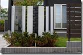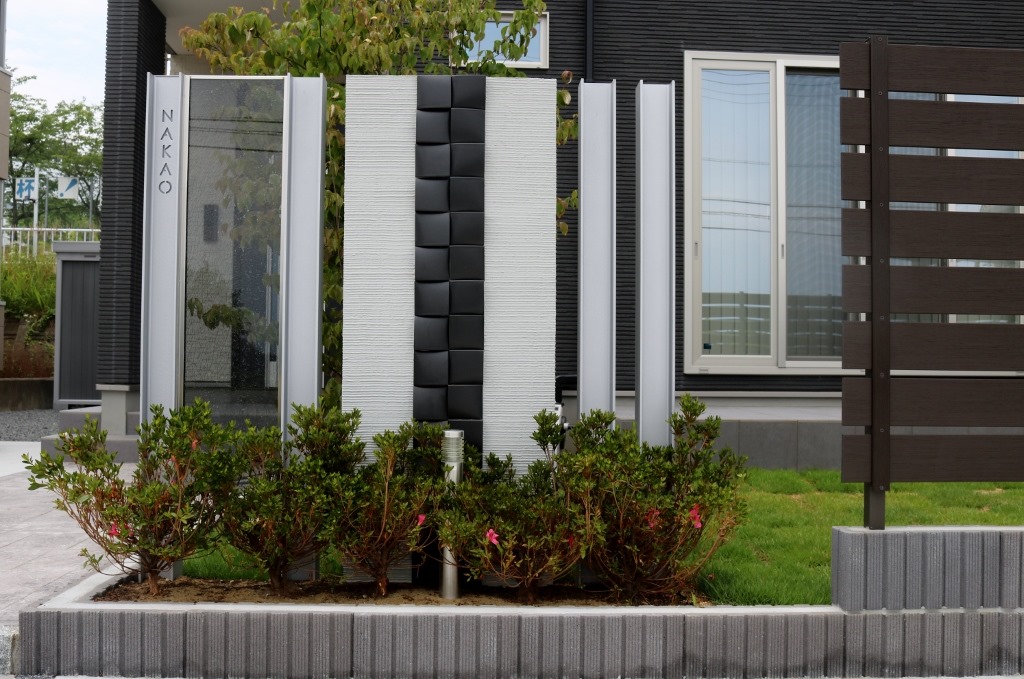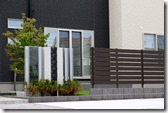 シンプルモダンの建物に合わせた目隠しフェンス デザインで樹脂フェンスの色をブラックブラウンを使用した飯綱町のエクステリア。
