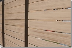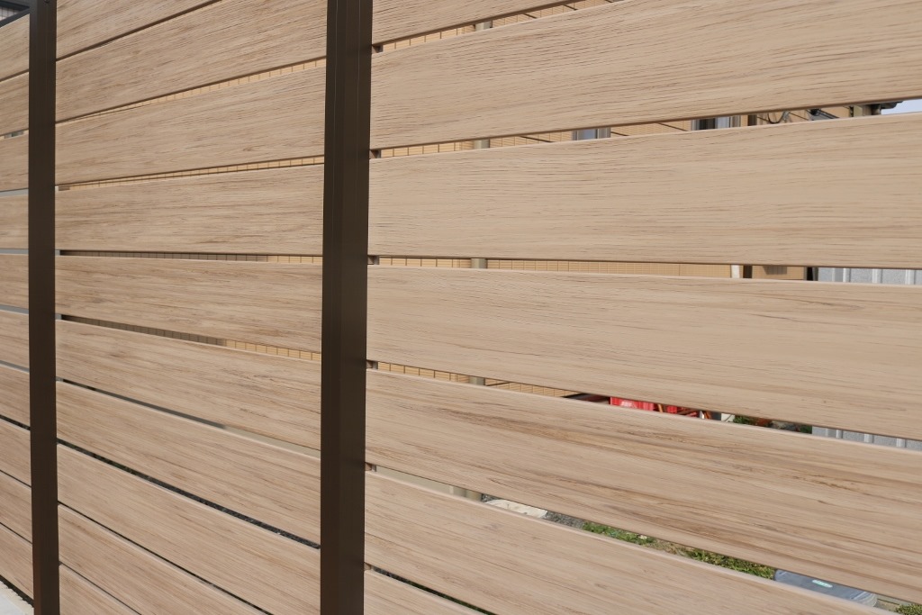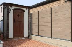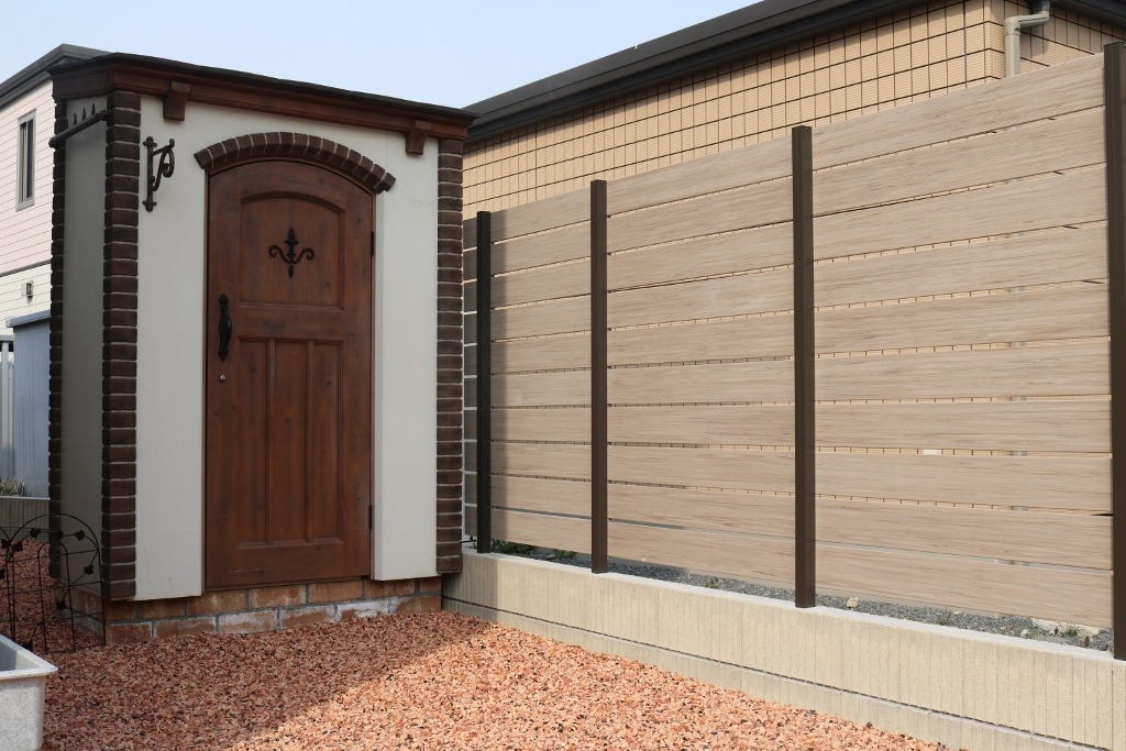建物の正面南側はレンガ積みですが、東西の側面は化粧ブロツクを積んだ上に樹脂フェンス(アルファウッド)の新色マーブルブラウンです。 外から見られても素敵に見えるカンナキュート物置も設置しました。