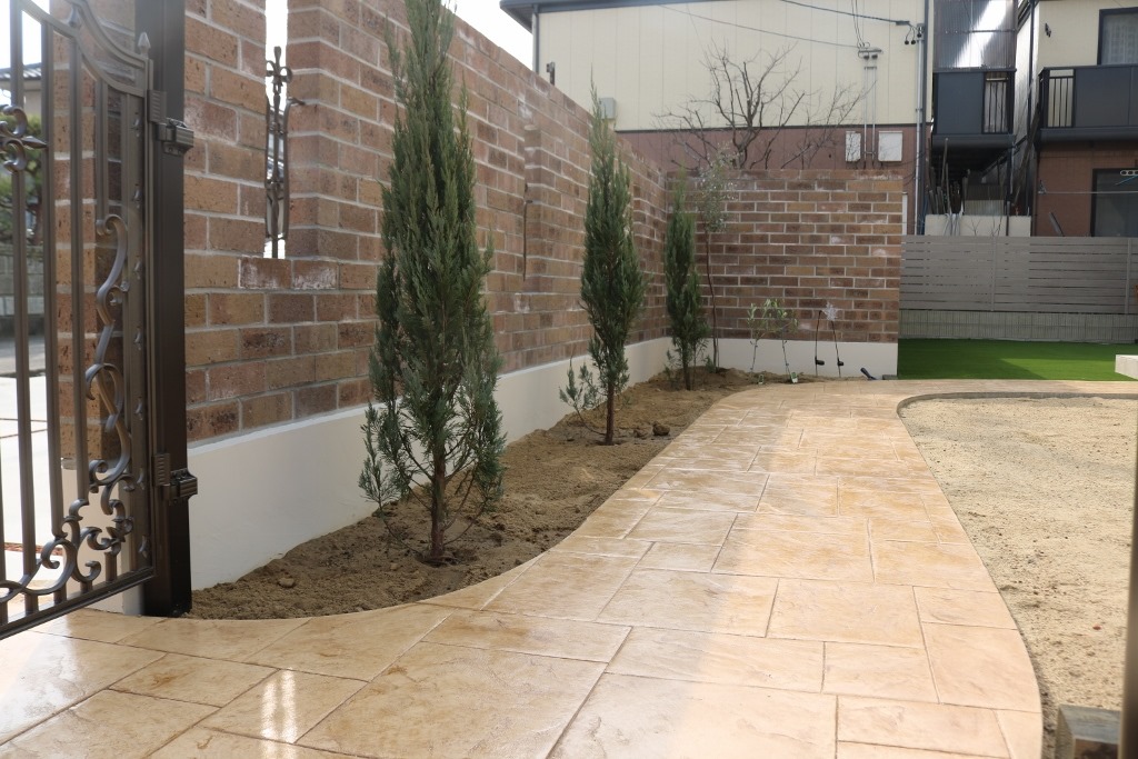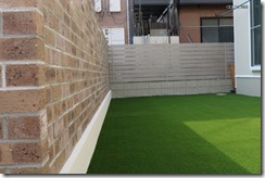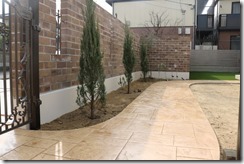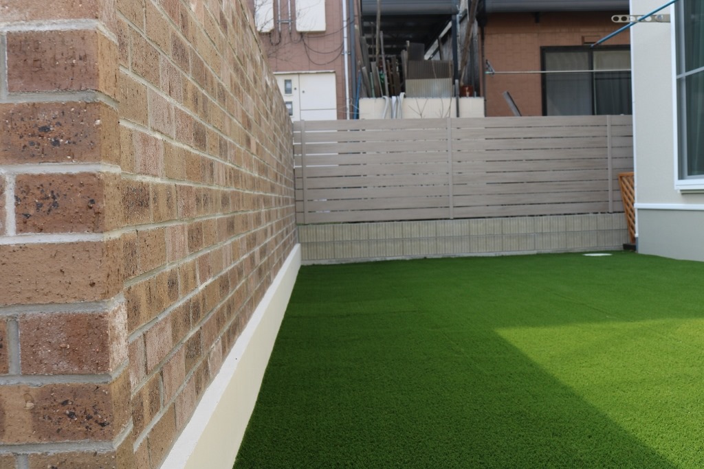 玄関までの通路はスタンプコンクリートのアシュラ模様で庭は手入れの楽な人工芝を砕石路盤の上に防草シートを敷きこみその上に人工芝を敷きこんでいます。