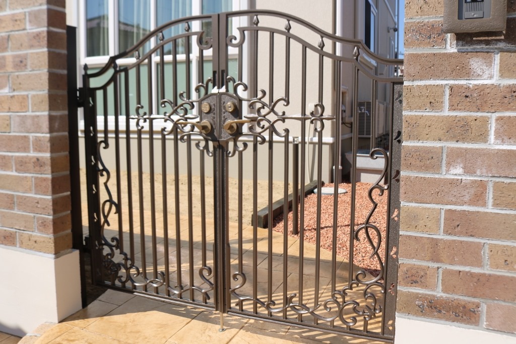 レンガ積みに似合う門扉はアルミ鋳物門扉でデザイン性の高いものが良いのでディーズガーデンのレンヌ(ロイヤルブラウン)ヲ取り付けました。