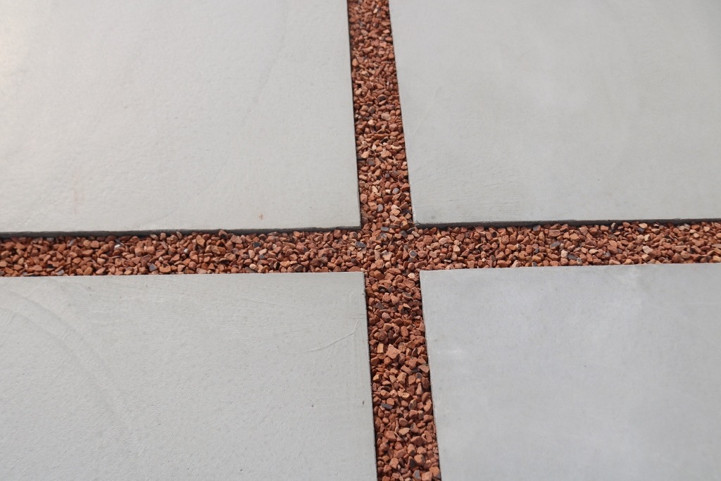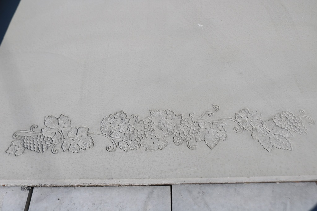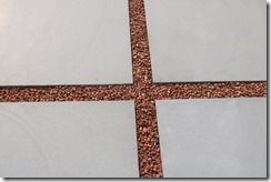 駐車場は三台分で入口にボーダーアートで葡萄の模様を形押ししています。コンクリート土間のクラック軽減の為の目地に破砕瓦テコラを入れました。