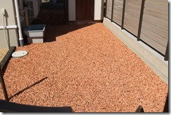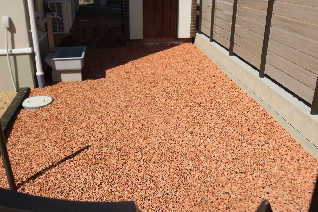 敷地内は植栽スペース部分以外は雑草対策を考えて防草シートにテコラを敷きこみました。