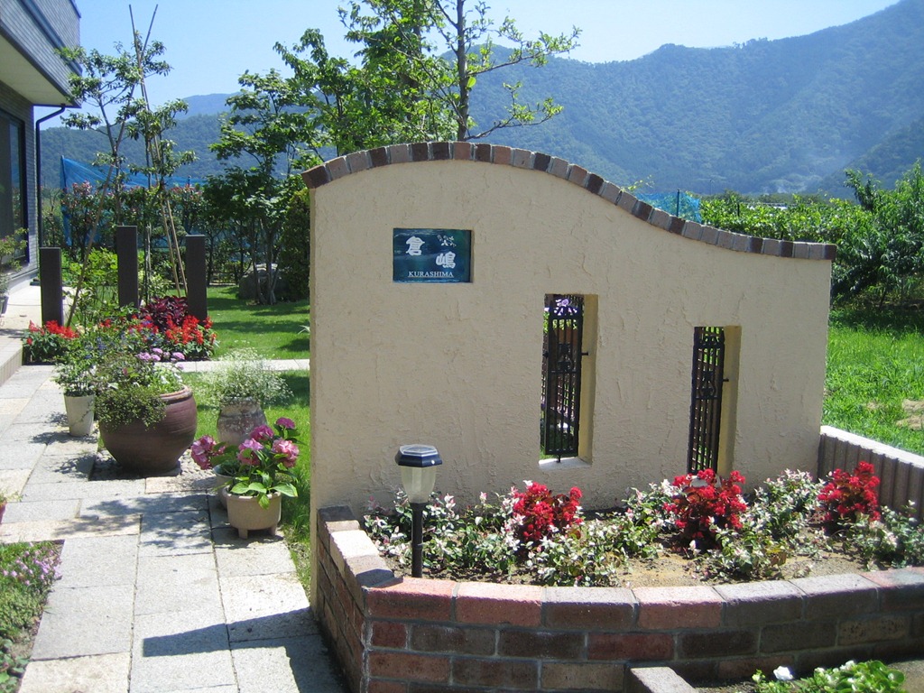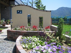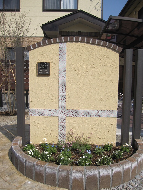 Rの天端にブラウンのショコラランガを乗せ笠木にしました、笠木があると壁がくっきりと見えます、ラフ仕上げで塗られた壁にはモザイクガラスを十字に貼りアクセントにしました、右側に2本左側に1本ポールを立てています、手前の花壇のレンガもブラウン系のものを使用しています。