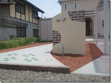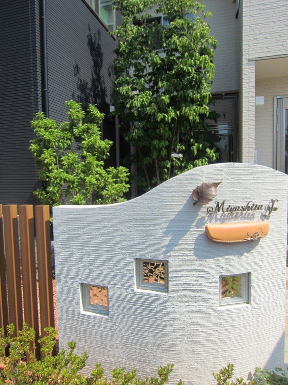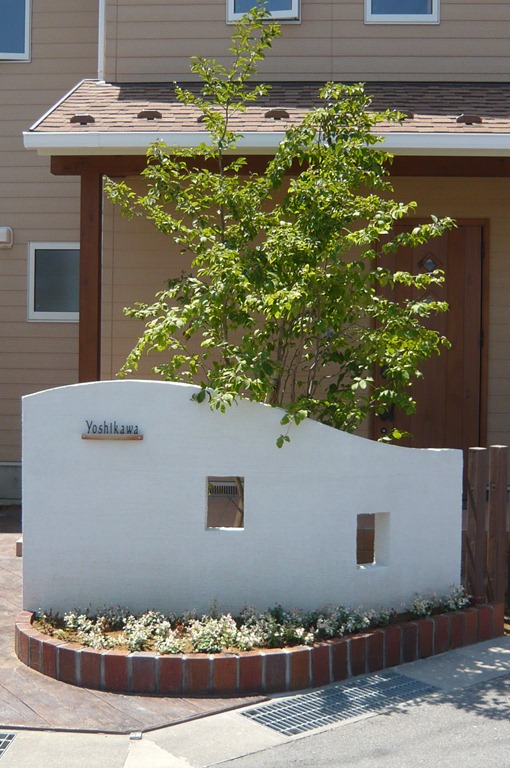 クジラの形にも見えそうなラインの塗壁門柱です、サインの付け位置からなだらかに下がるライン、低く下がったころから横にFRP素材で出来た角柱が続く門柱の後ろ側には株立のシンボルツリーを植え、門柱前にはレンガを立てて作った花壇の中に常緑のハツユキカズラを打ています、スリットは小さ目なものを2カ所。