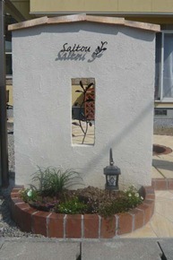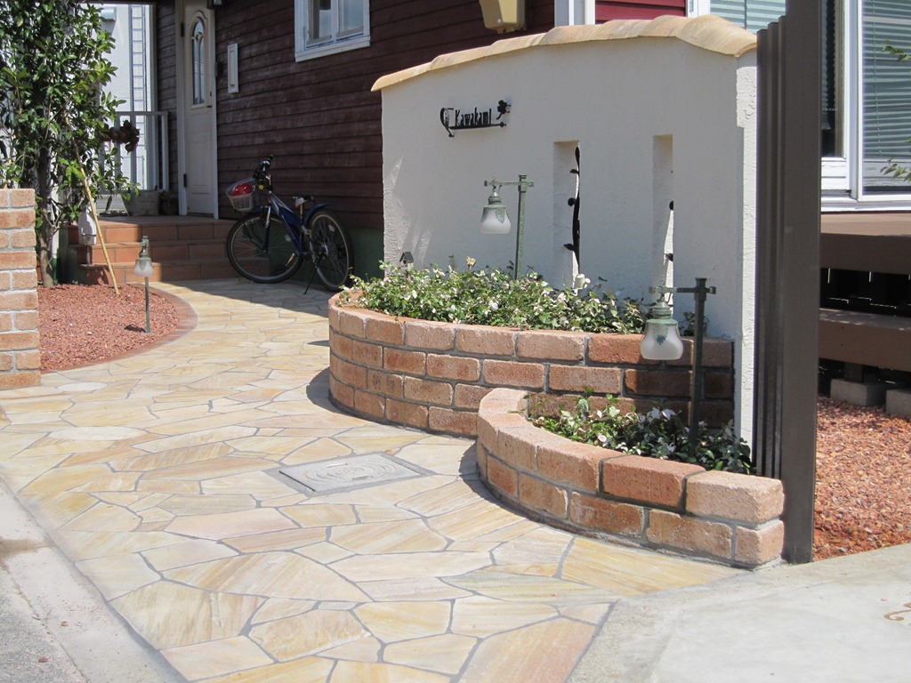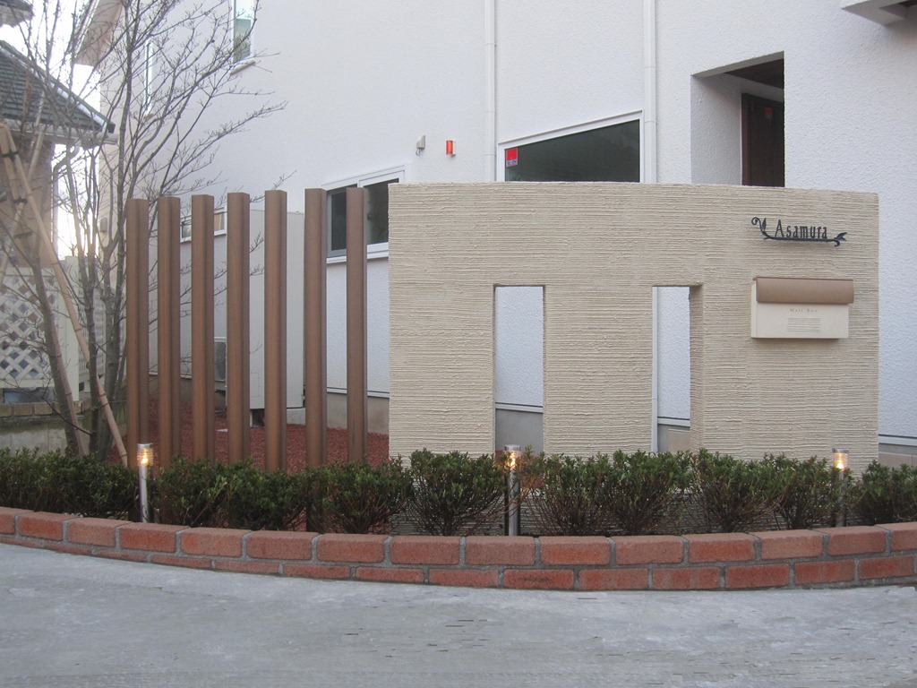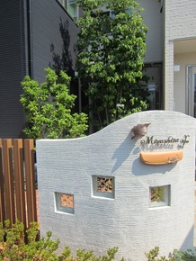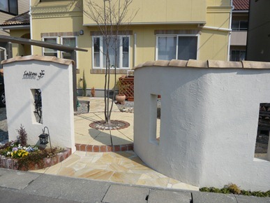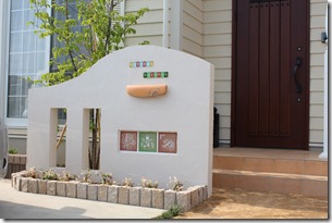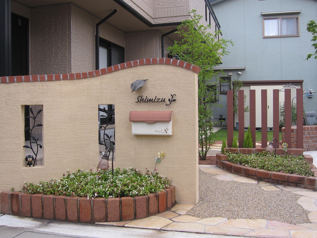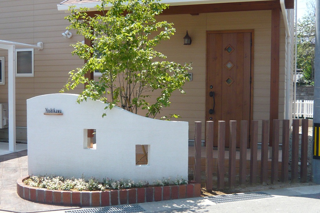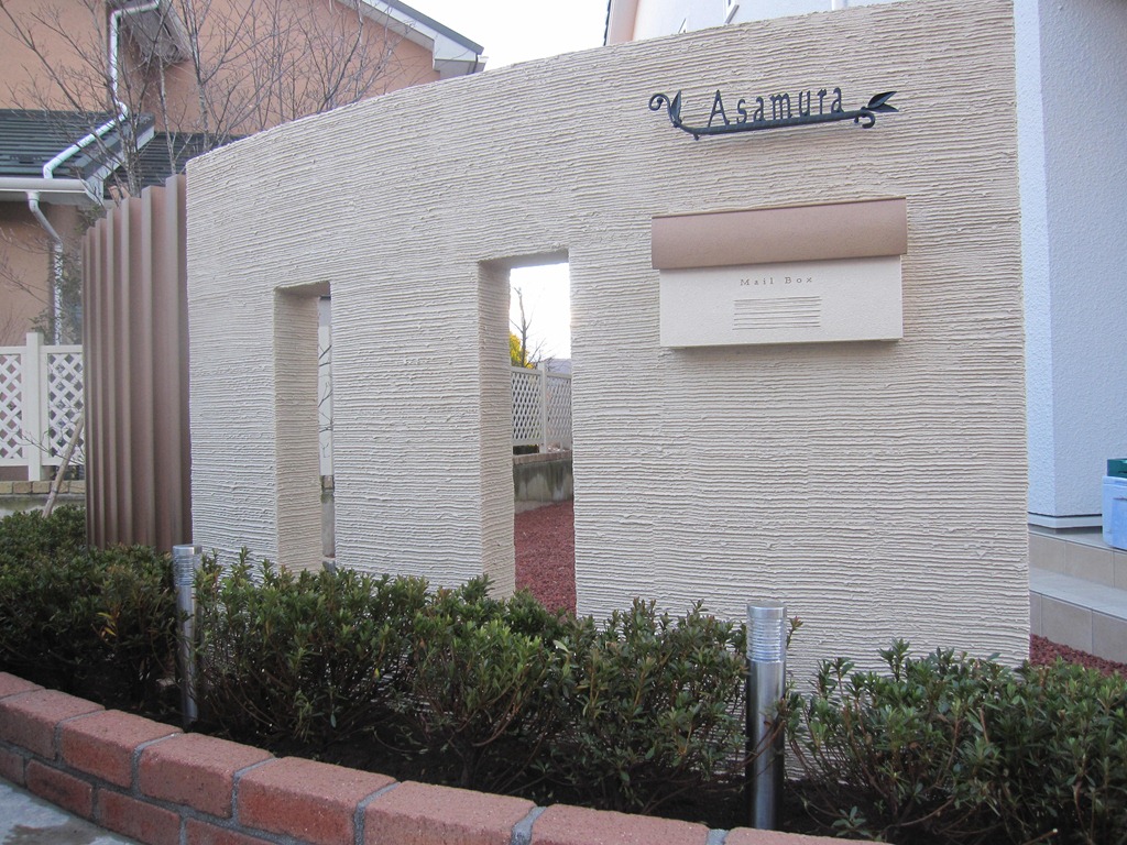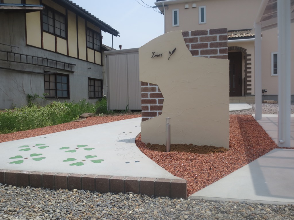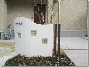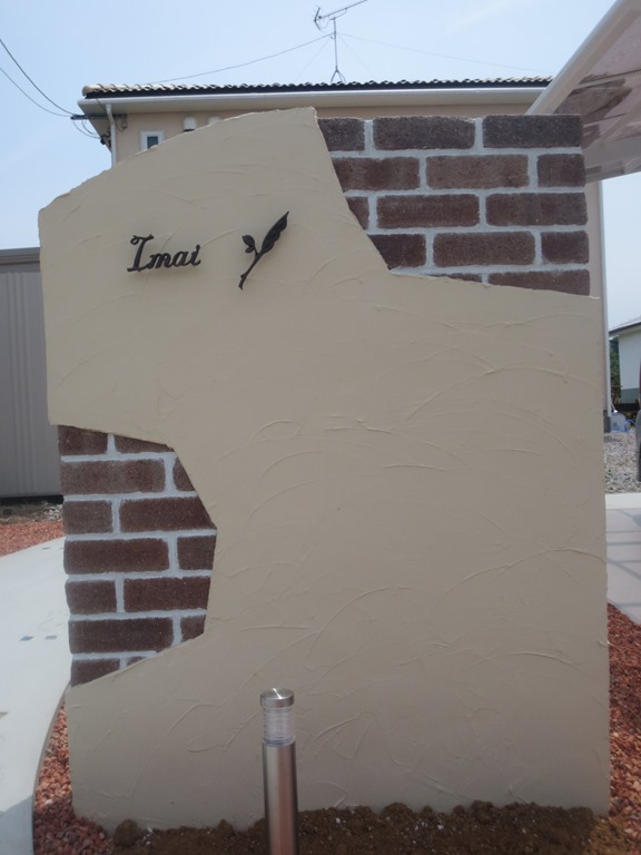 洋風の建物には、塗壁の門柱が似合います、広めの巾のある塗壁にブロバンス瓦を乗せ、縦に細長いスリットを二か所作り、手前にはレンガを積み花壇を作りました、緩い曲線の門柱は前後にもRのラインを作っています、塗壁はコテで仕上げていくので壁面の塗り方を変えるだけでも表情が変わります。