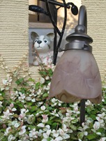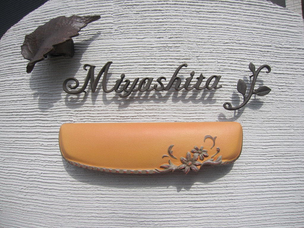 洋風の門柱には、良く合うサインとポストが必要です、アルミ鋳物のサインの横にミニオーナメントA型を付れてポストは埋め込みタイプのテラコッタをイメージしたブロバンススタイルのポーチFノオレンジ、そしてサインの斜め上には葉っぱの形をした表札灯リーフとディーズガーデンの商品で揃えました、門柱横のポールは樹脂で出来ているスレンダーポールです。
