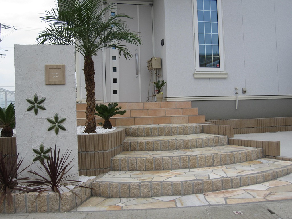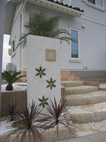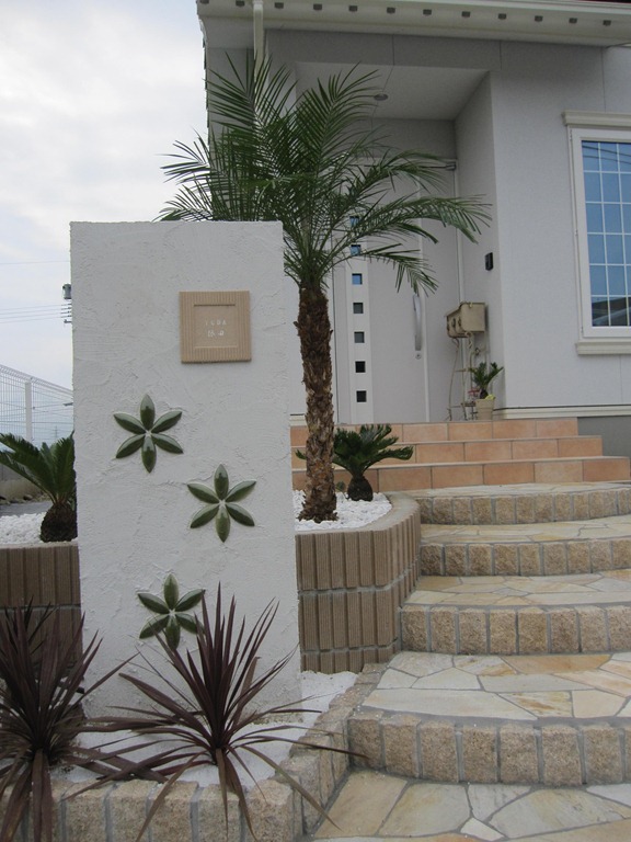 扇形に下に広がるように作られた段数のある階段の手前横に作られた、巾を細めにして作った塗壁の門柱に3カ所緑色のフラワータイルを貼りました、白い壁に緑のタイルが上手くマッチしています、階段上に植えられたフェニックスが南国ではないかと錯覚させられそうです。 長野市のエクステリア 施工実績です。
