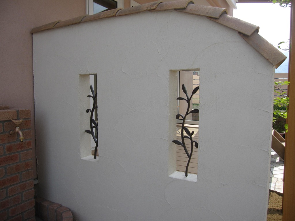 既存のウッドデッキが道路から良く見えて使いづらかったので、道路側の側面にブロ゛ンス瓦を乗せた塗塀を作りました、スリットにはRフィックスフェンスを取り付けているので、圧迫感は多少解消されています、今まで以上にウッドデッキが使いやすくったと思います。
