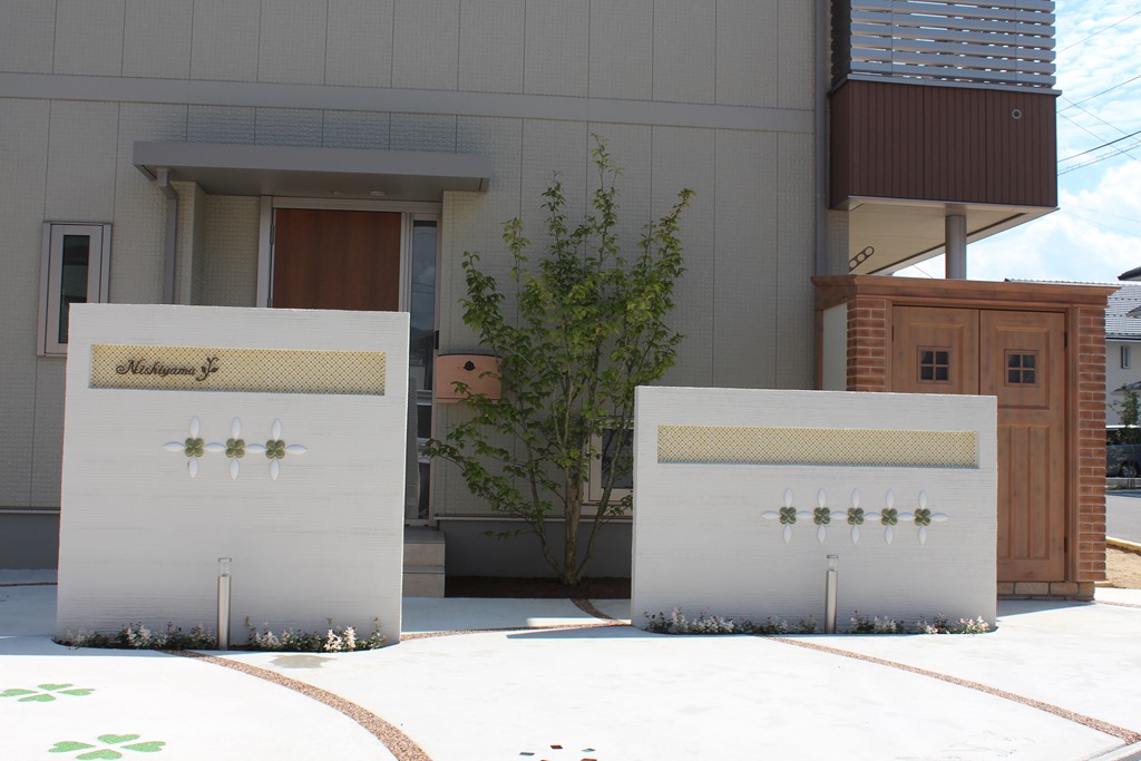 門柱と塀を白の塗壁でラフに仕上げました、ドチラもブロバンス瓦を乗せて曲線を作りました、明るい色の建物の壁と色を変える事で、より綺麗に門柱・塀が見えています床の天然石のイエローカラーにも、塗壁が良く生えています。